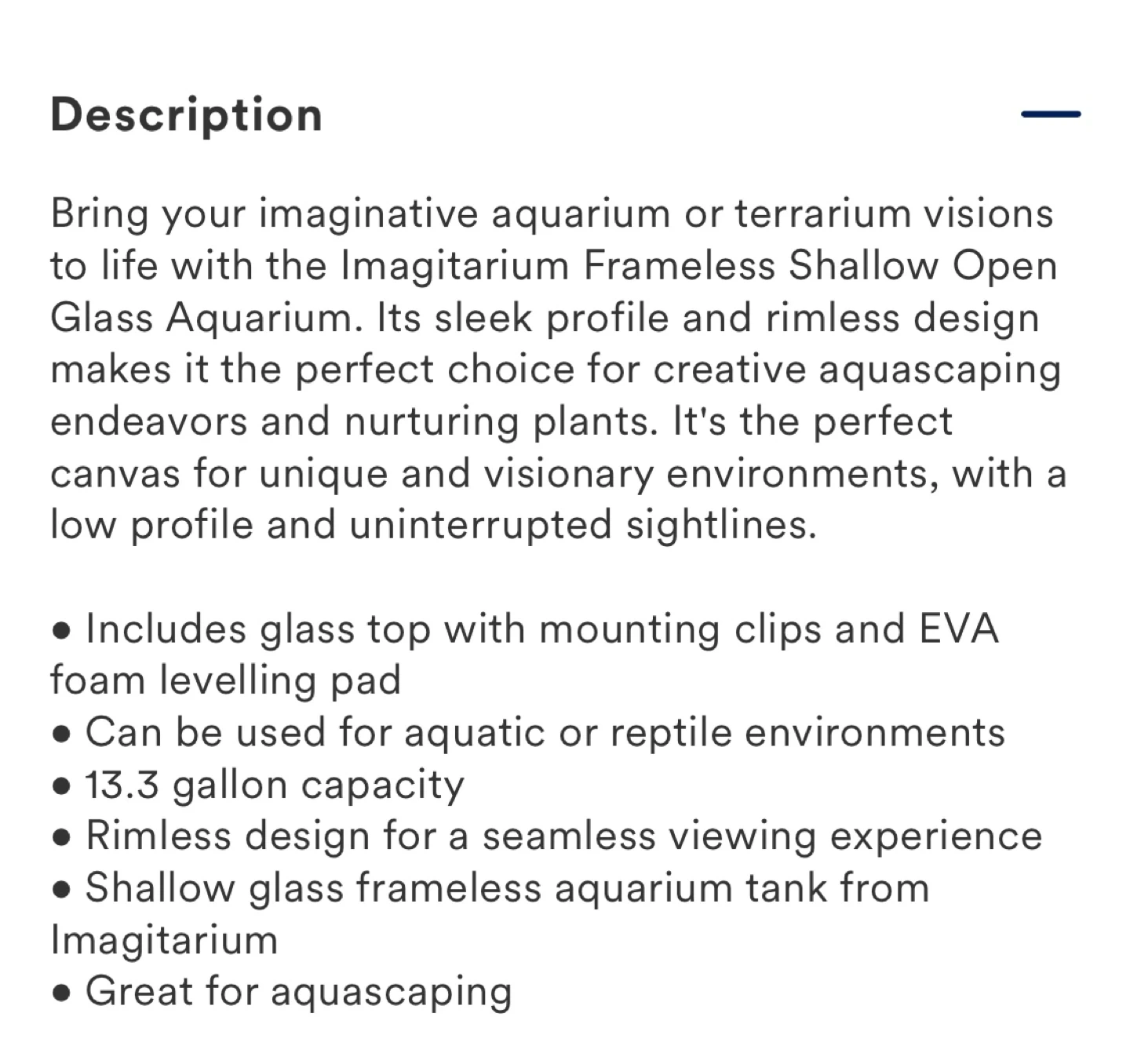 This is an Imaginitarium 13.3 gallon frameless shallow glass aquarium. It has a rimless design for a seamless viewing experience. It can be used for aquatic or reptile environments!