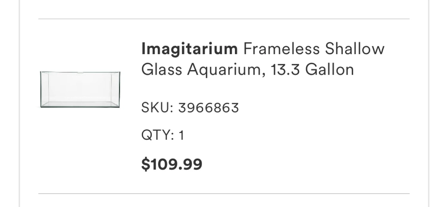 This is an Imaginitarium 13.3 gallon frameless shallow glass aquarium. It has a rimless design for a seamless viewing experience. It can be used for aquatic or reptile environments!