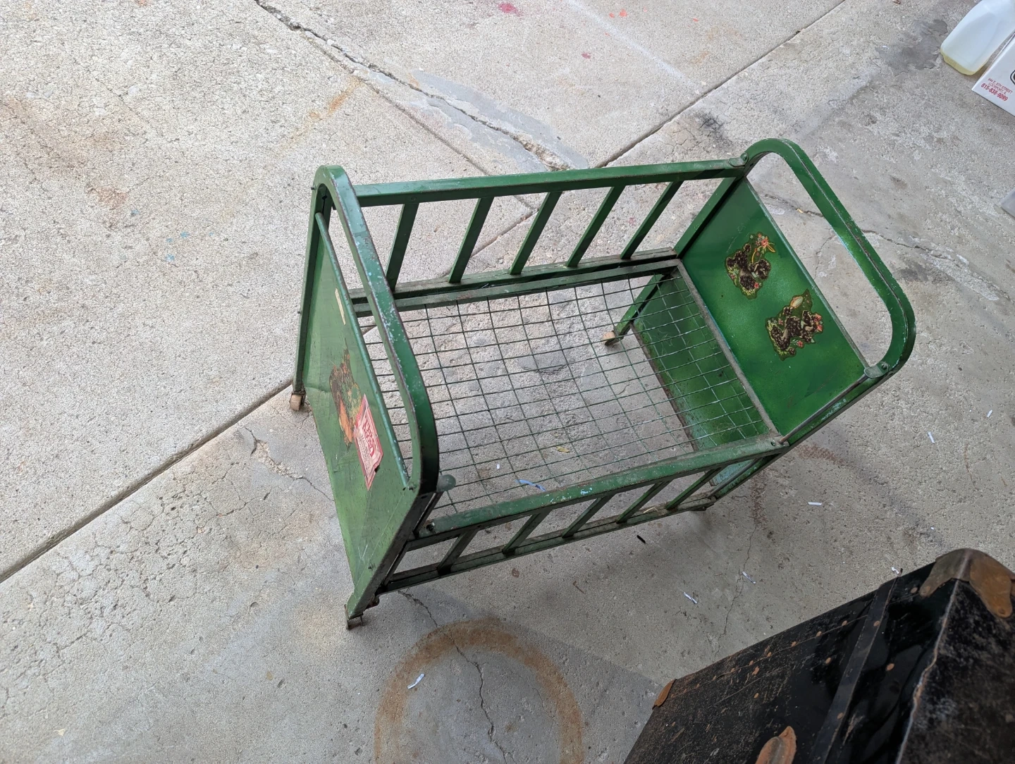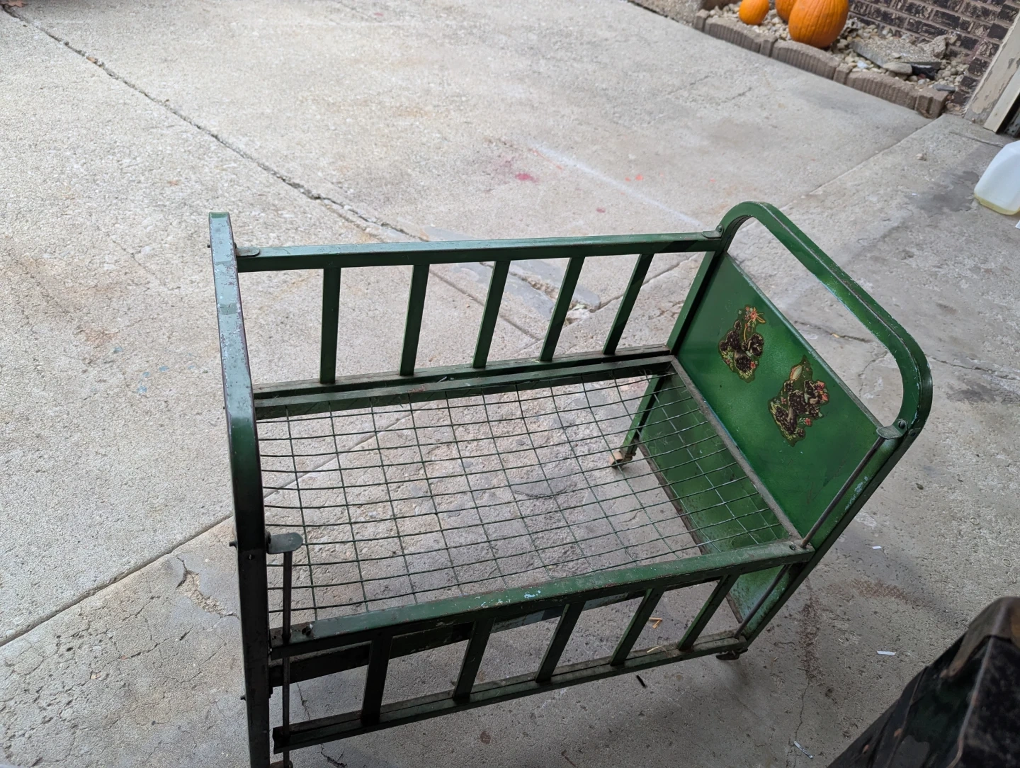 Here's a vintage green metal baby doll crib toy. It has some cute designs on the side which are stickers? Some are faded which is common with its age. It's in good condition for its age.