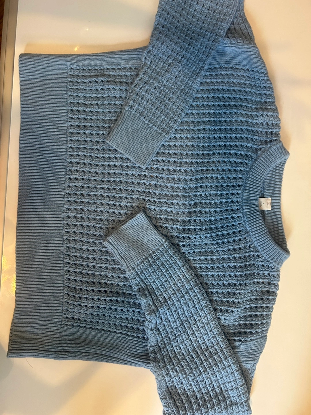 A cozy light blue knit sweater! It's in great condition and ready for a new home. The material is soft and comfortable, perfect for layering or wearing on its own. Feel free to reach out if you have any questions!