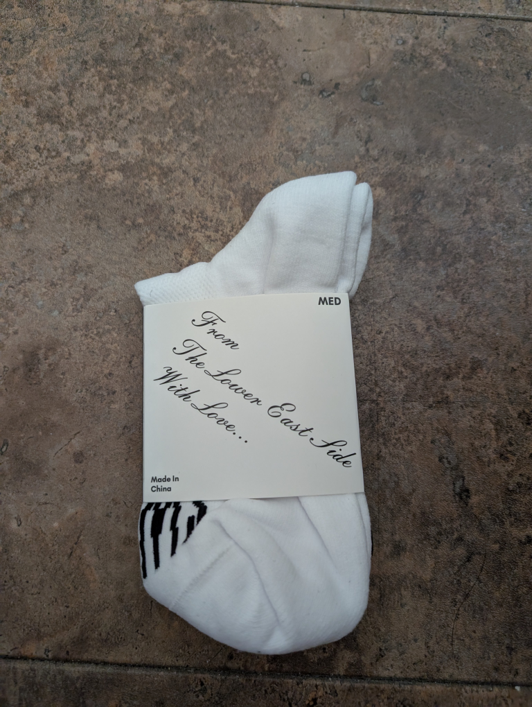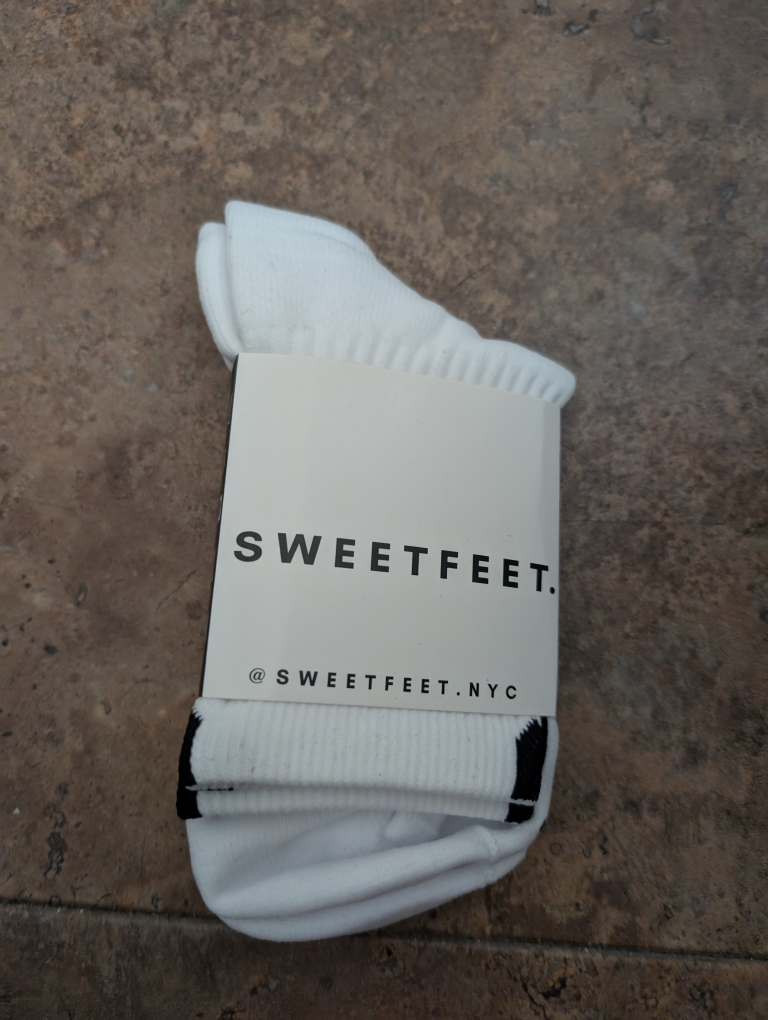 Selling a pair of Sweetfeet socks! They are white with black accents and size medium. The socks are new and ready for a new home.