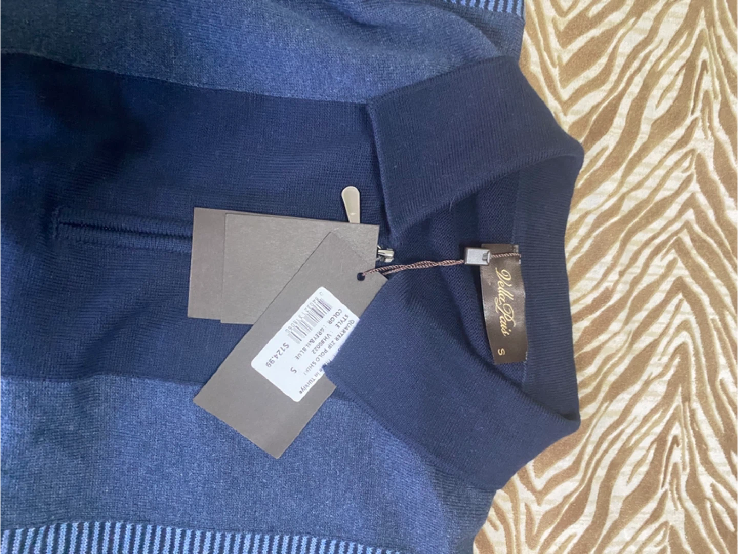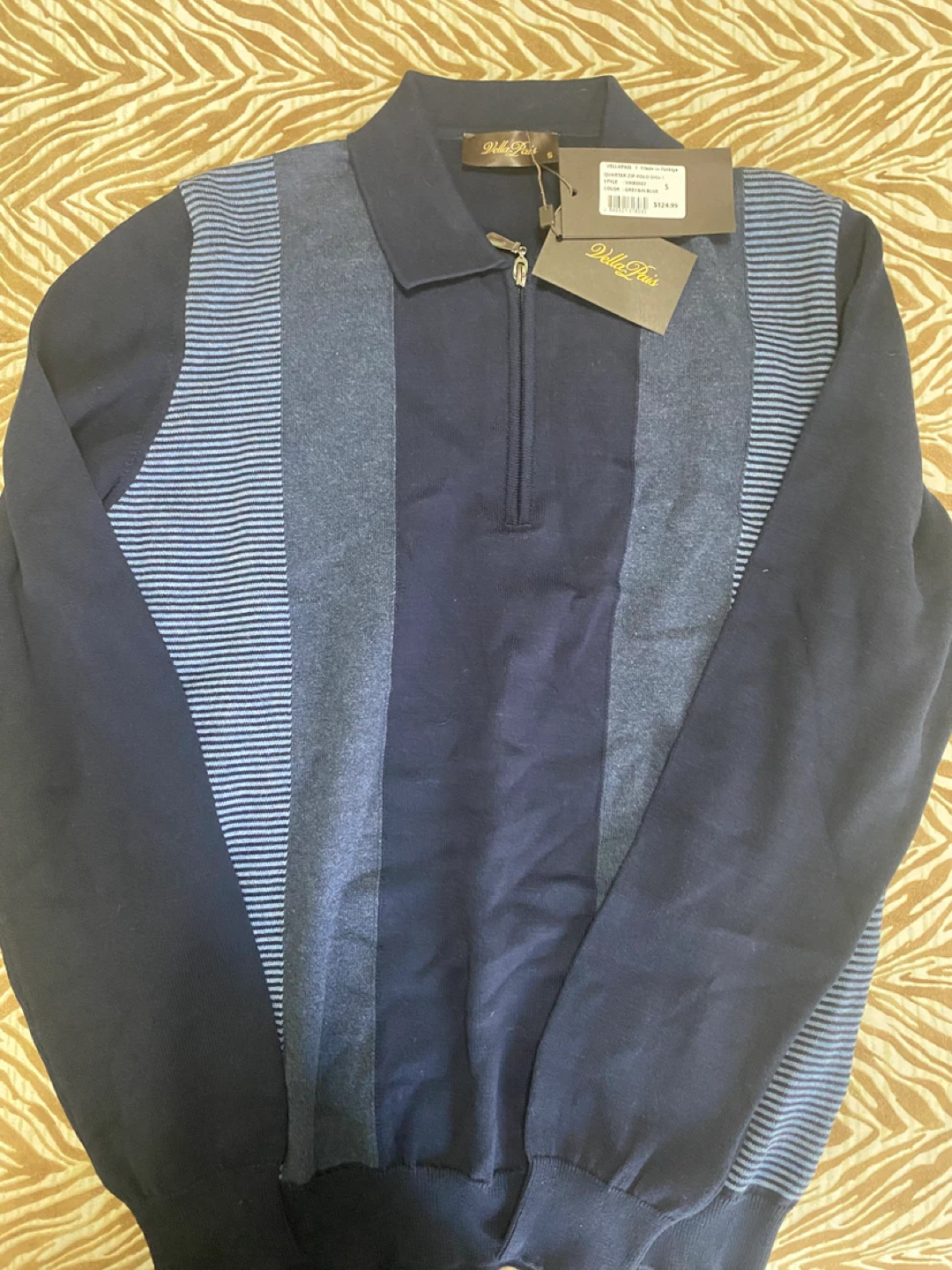 Vella Pais quarter zip pullover sweater. Features a colorblock design with varying blue stripes. Size S. Cotton blend material.