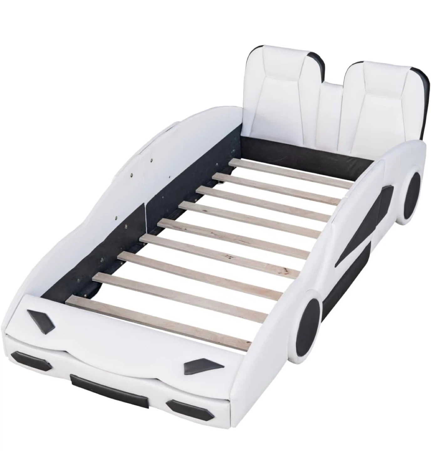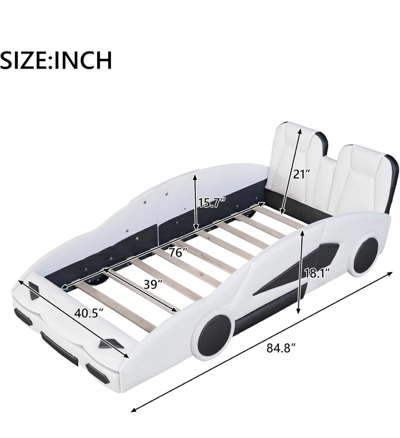 This race car bed frame is designed for a twin-size mattress. It features a playful race car design with upholstered headboard and footboard. Bed frame dimensions are 84.8" L x 40.5" W x 21" H. This bed is perfect for a child's bedroom!