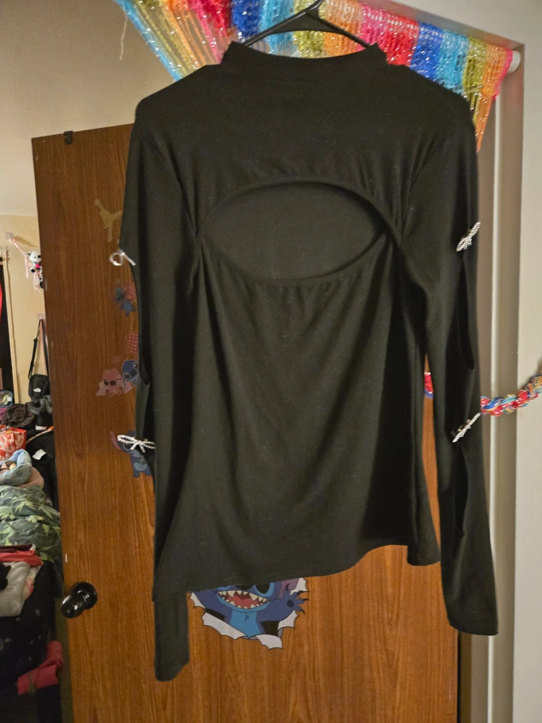 Black long sleeve top with a cutout detail on the back. Features adjustable tie details on the sleeves. It's a unique piece that adds a stylish touch to any outfit!