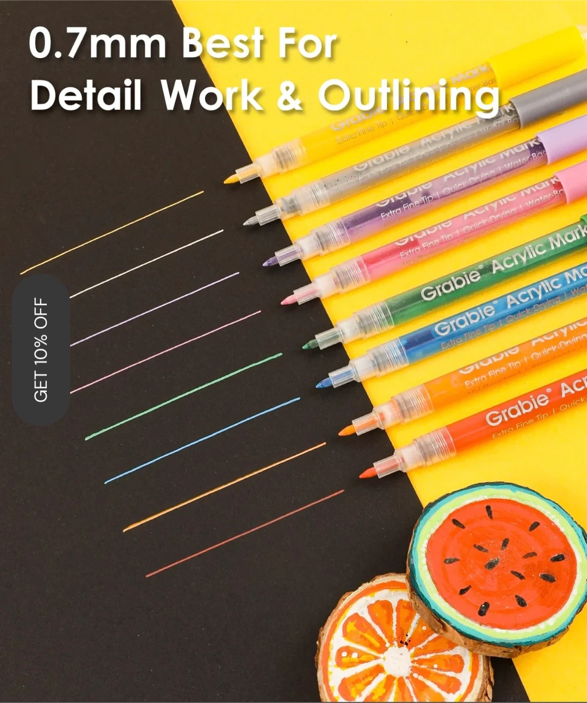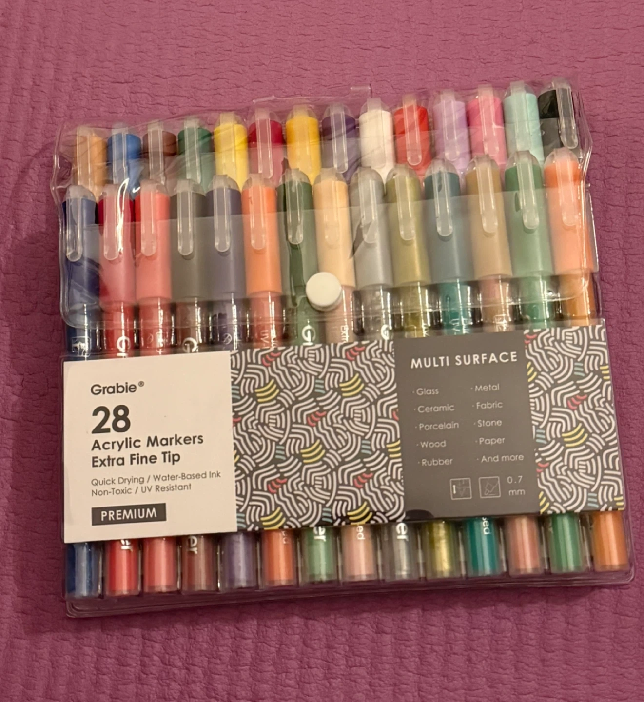 This set includes 28 Grabbie acrylic markers with an extra fine tip. They're water-based ink and UV resistant. Suitable for multi-surface use including glass, ceramic, metal, fabric, and wood. Tip size is 0.7 mm.
