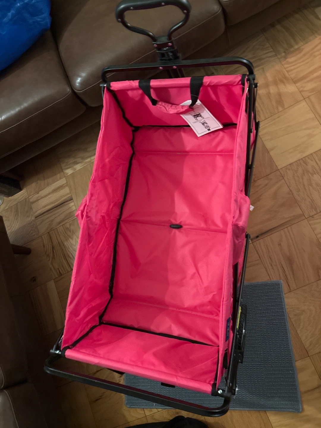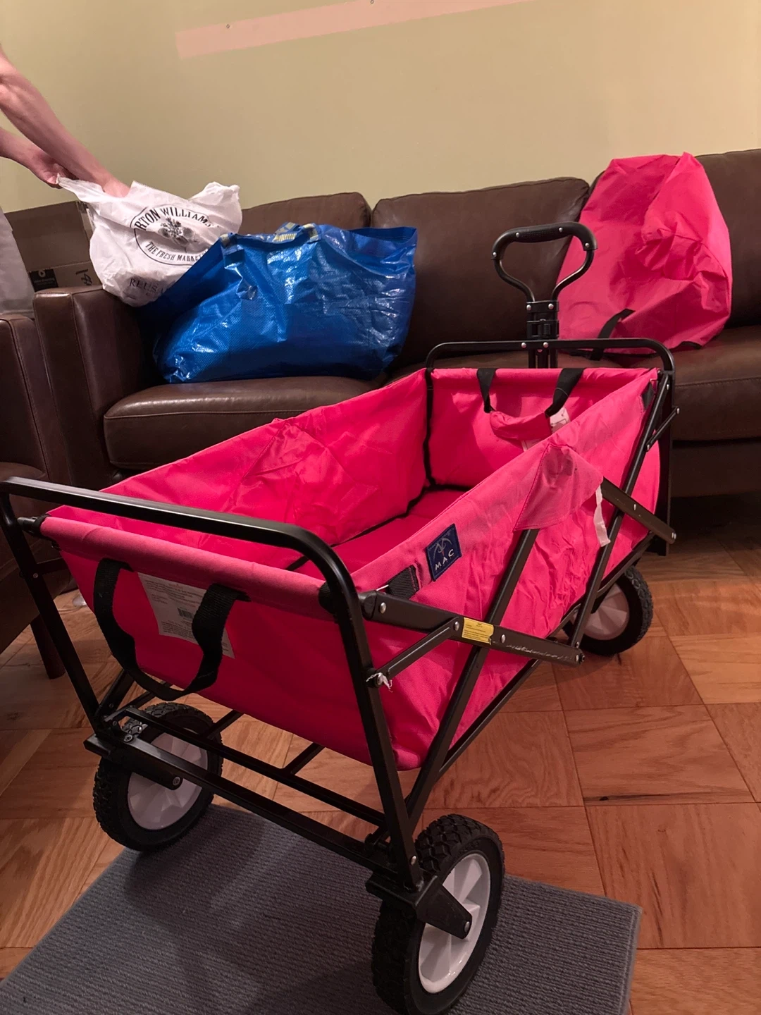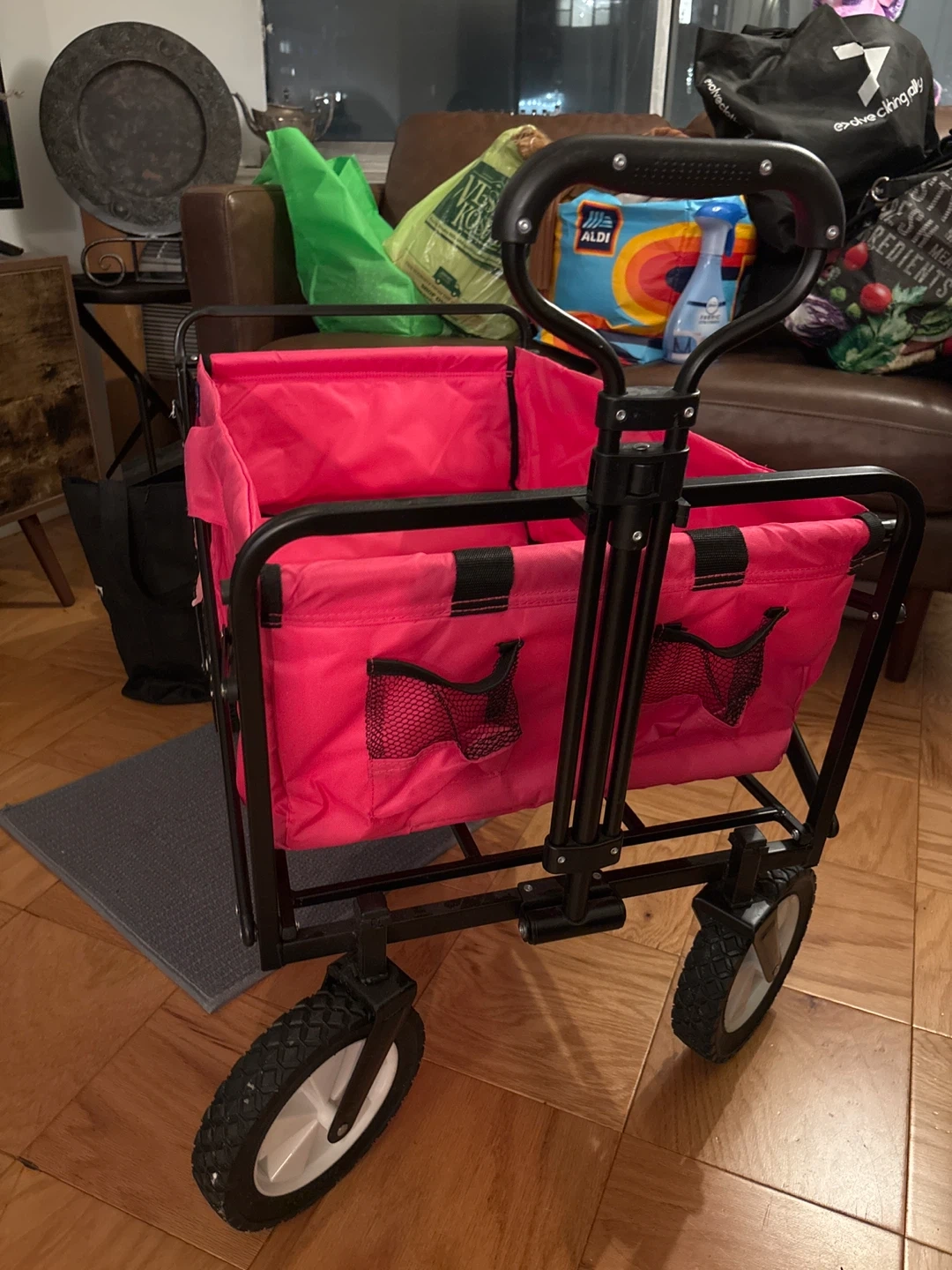 This MAC folding outdoor wagon cart is bright pink. It has a sturdy metal frame and four wheels for easy transport. Multiple mesh pockets on the back offer convenient storage for smaller items.