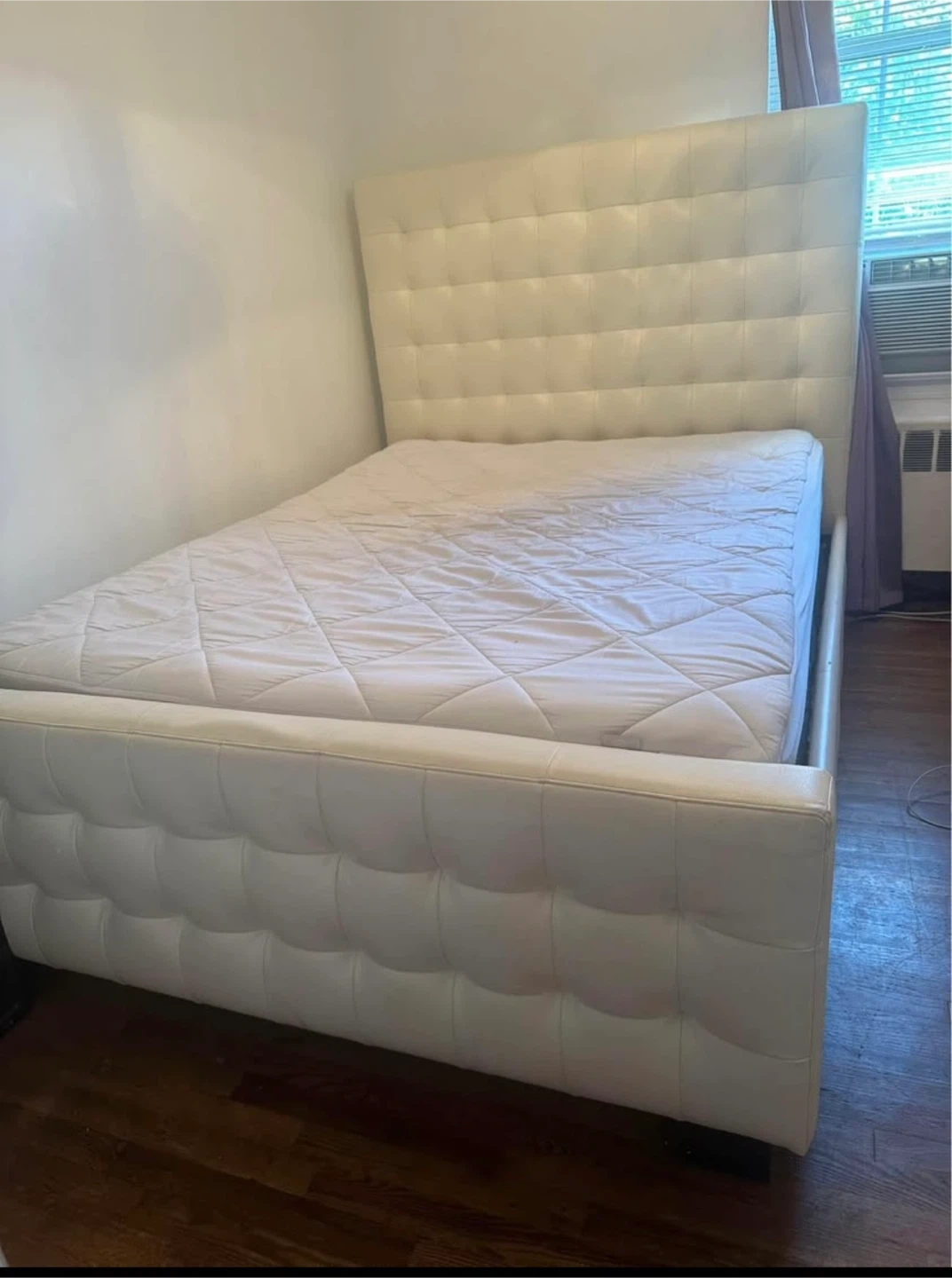 60A white queen-size bed, including a mattress and box spring. The bed is used but in excellent condition, looking almost new with no visible signs of wear. The frame is sturdy, and the mattress is clean and comfortable, providing great support for a good night's sleep. Perfect for anyone looking for a reliable and stylish addition to their bedroom.