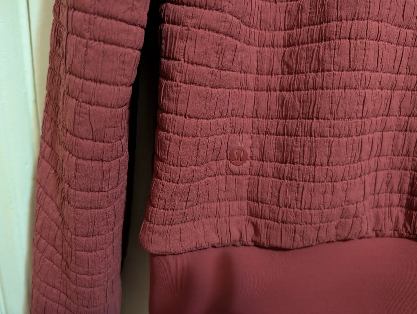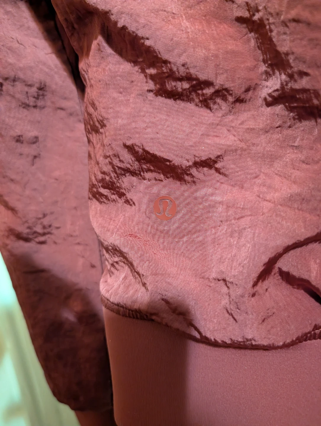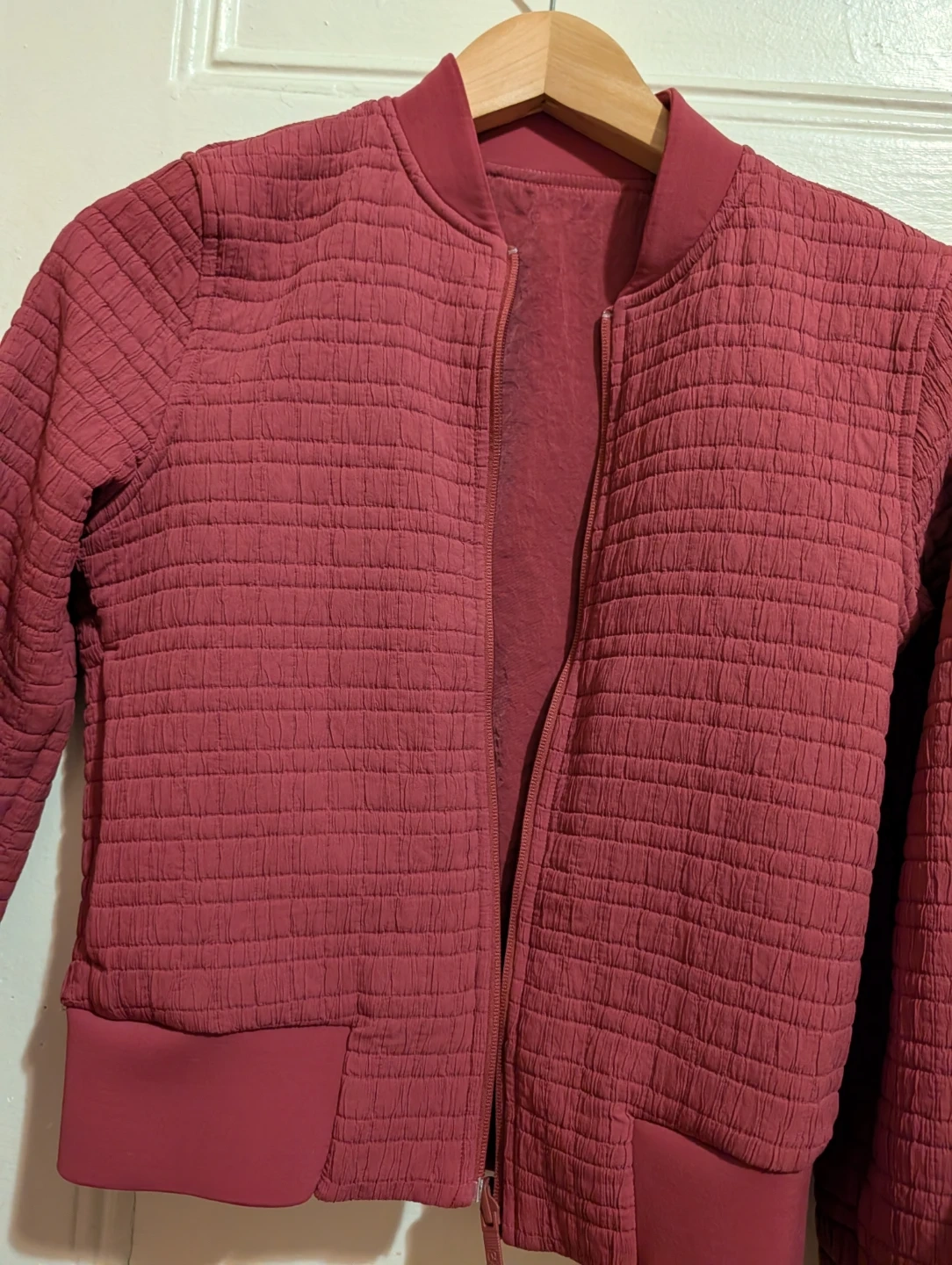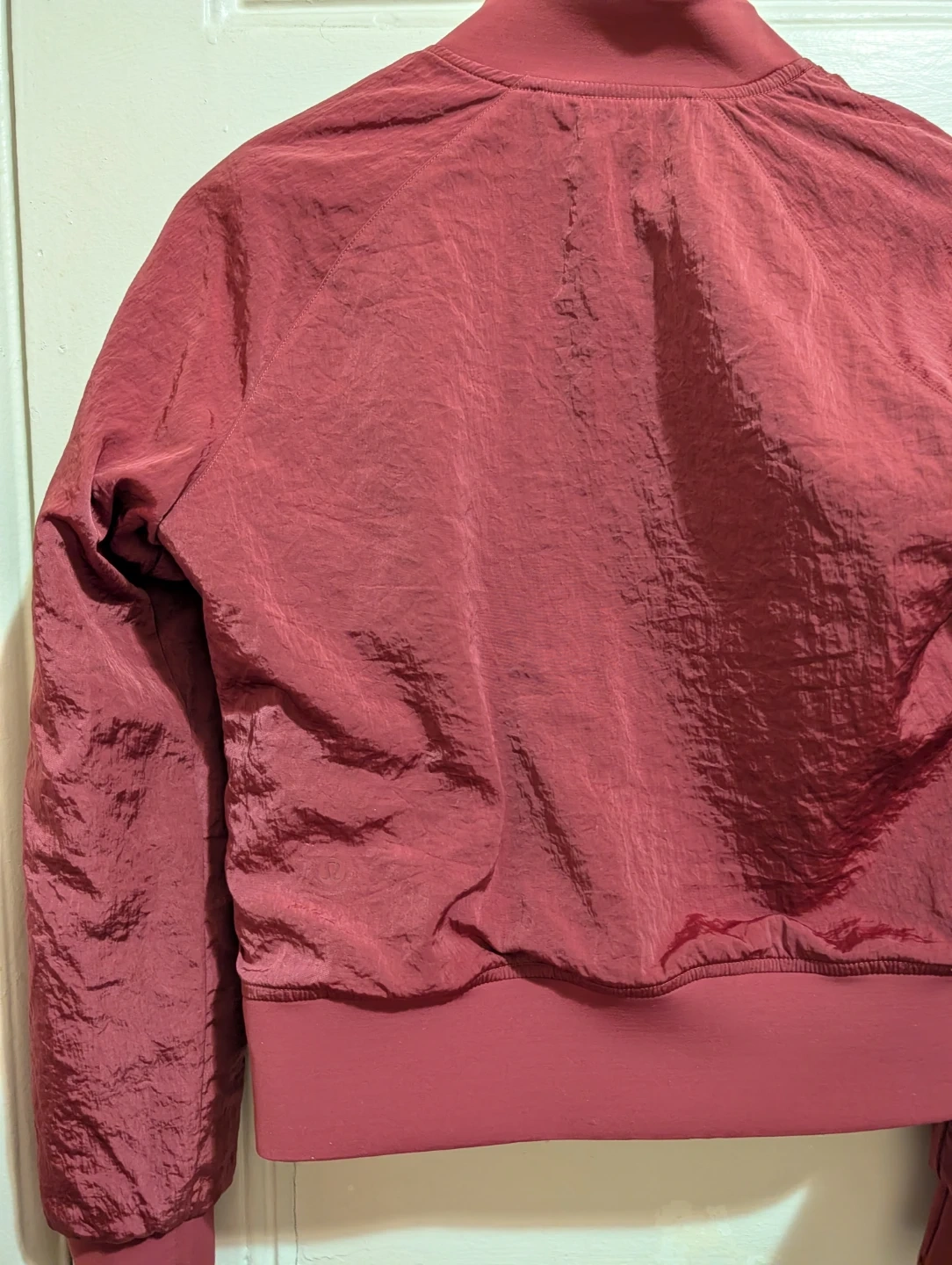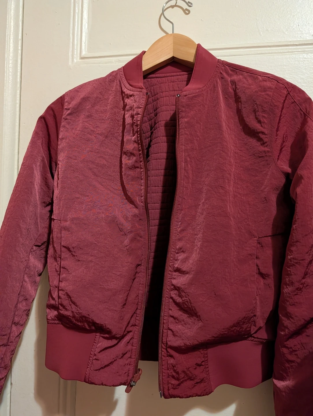 This is a Lululemon bomber jacket. It has a textured fabric on the sleeves and body. The jacket features a full zip closure. Size xs-s🥕
