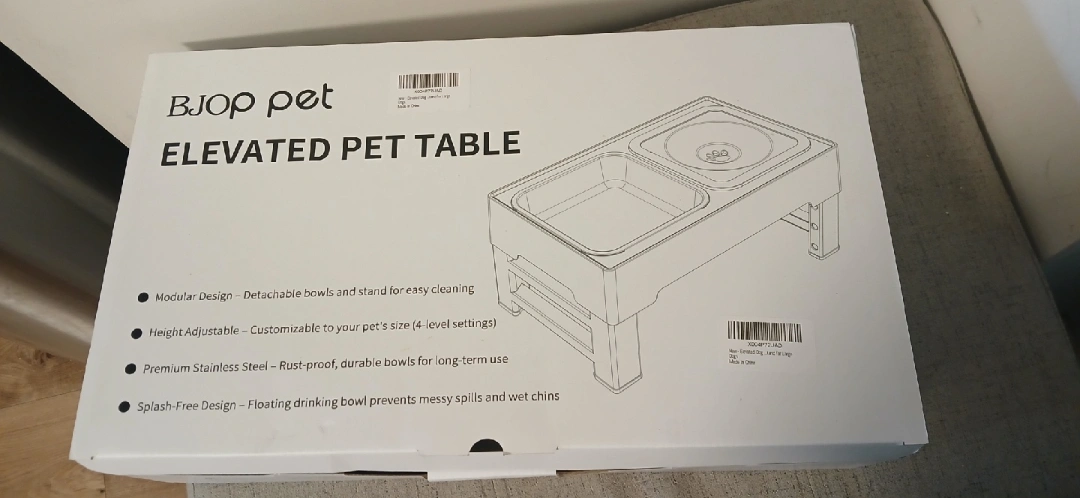 Selling a brand new BJOP Pet Elevated Pet Table! This table features a modular design with detachable bowls and stand for easy cleaning. It's height adjustable, customizable to your pet's size with 4 level settings. Made with premium stainless steel, it's rust-proof and durable for long-term use the legs have bone design, The splash-free design floating drinking bowl prevents messy spills and wet chins. Comes in the original box! my dog has anxiety and doesn't like seeing her reflection on the stainless steel bowl .