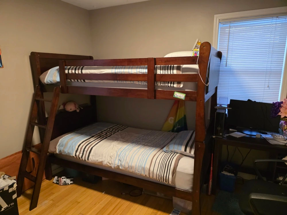 Selling a set of wooden furniture, including a dresser, bunk bed, desk, and chair. They're all in good condition and would be great for a bedroom or study space