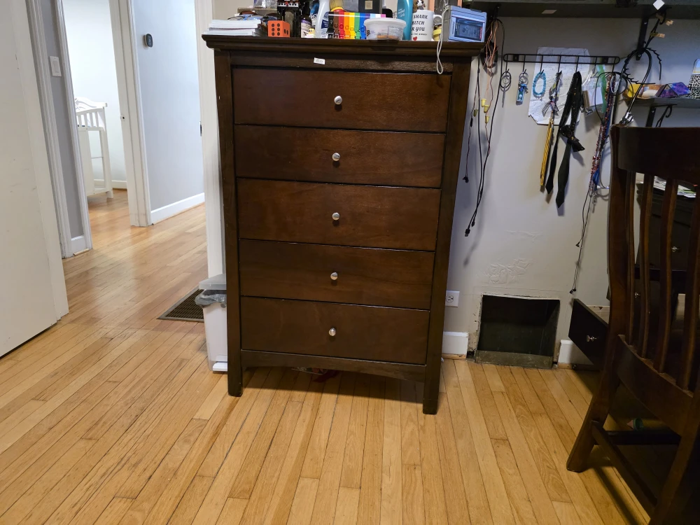 Selling a set of wooden furniture, including a dresser, bunk bed, desk, and chair. They're all in good condition and would be great for a bedroom or study space