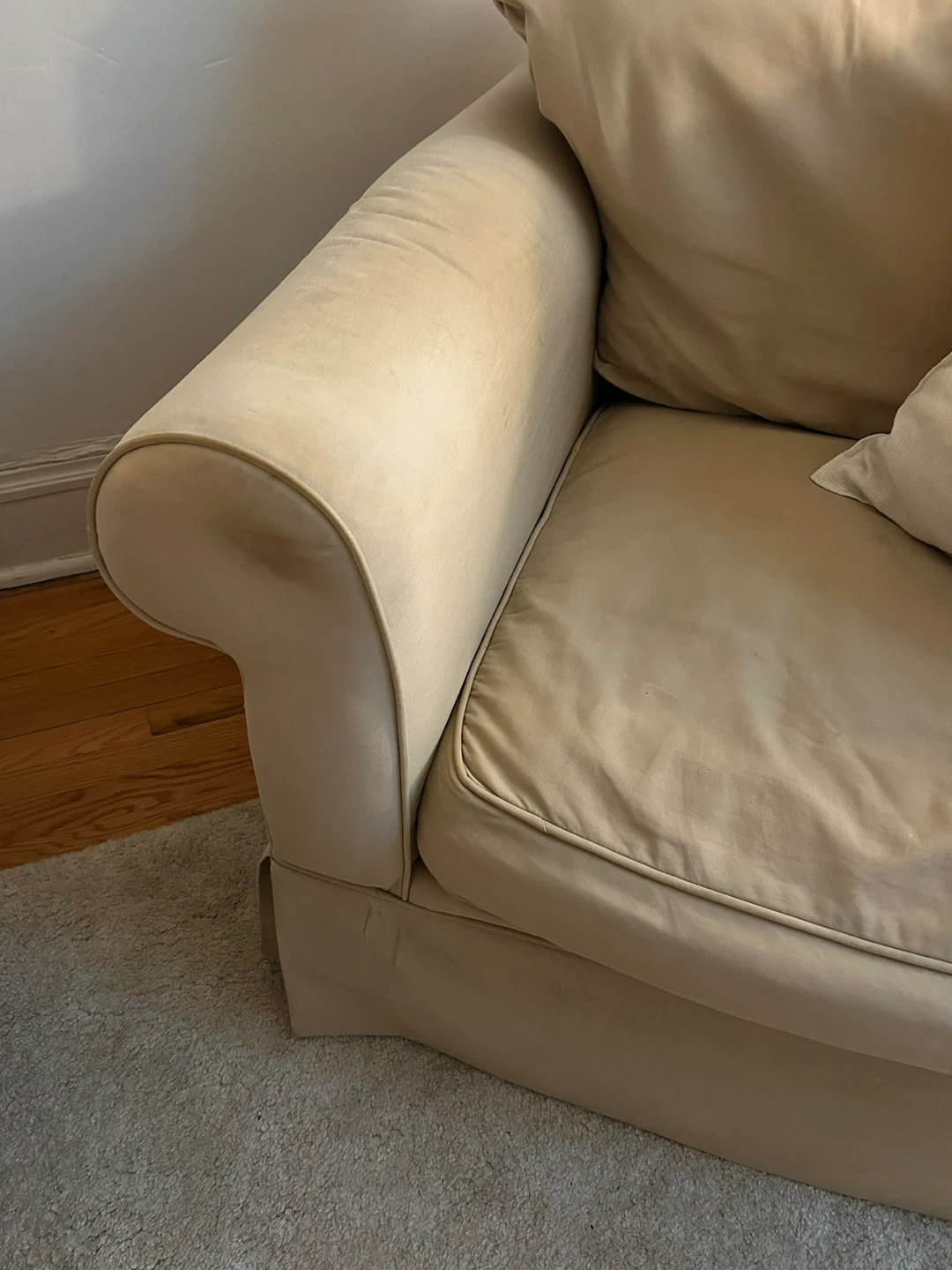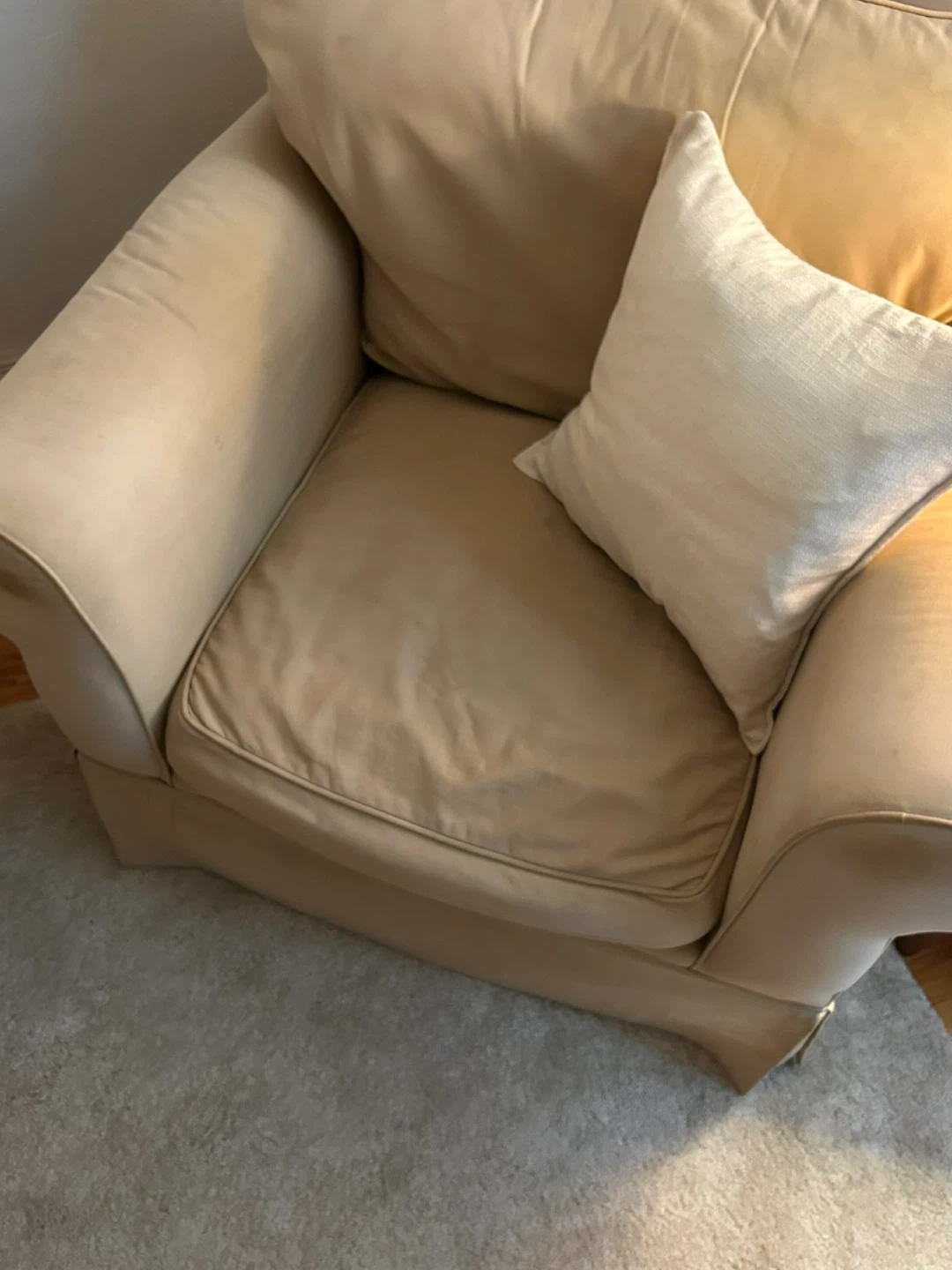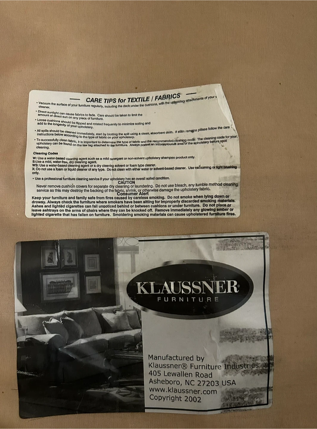 Comfortable light beige armchair with a matching ottoman. Manufactured by Klaussner Furniture Industries. Has been loved for many years, but is the perfect reading chair. Stained & heavily loved as shown above in the photos. Priced accordingly.