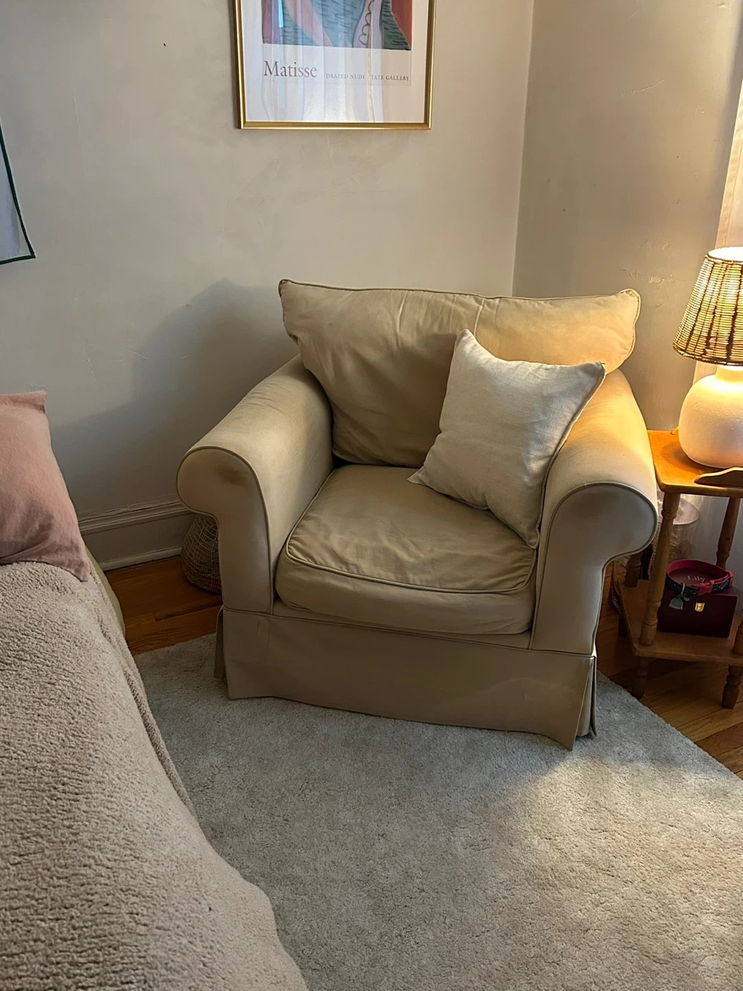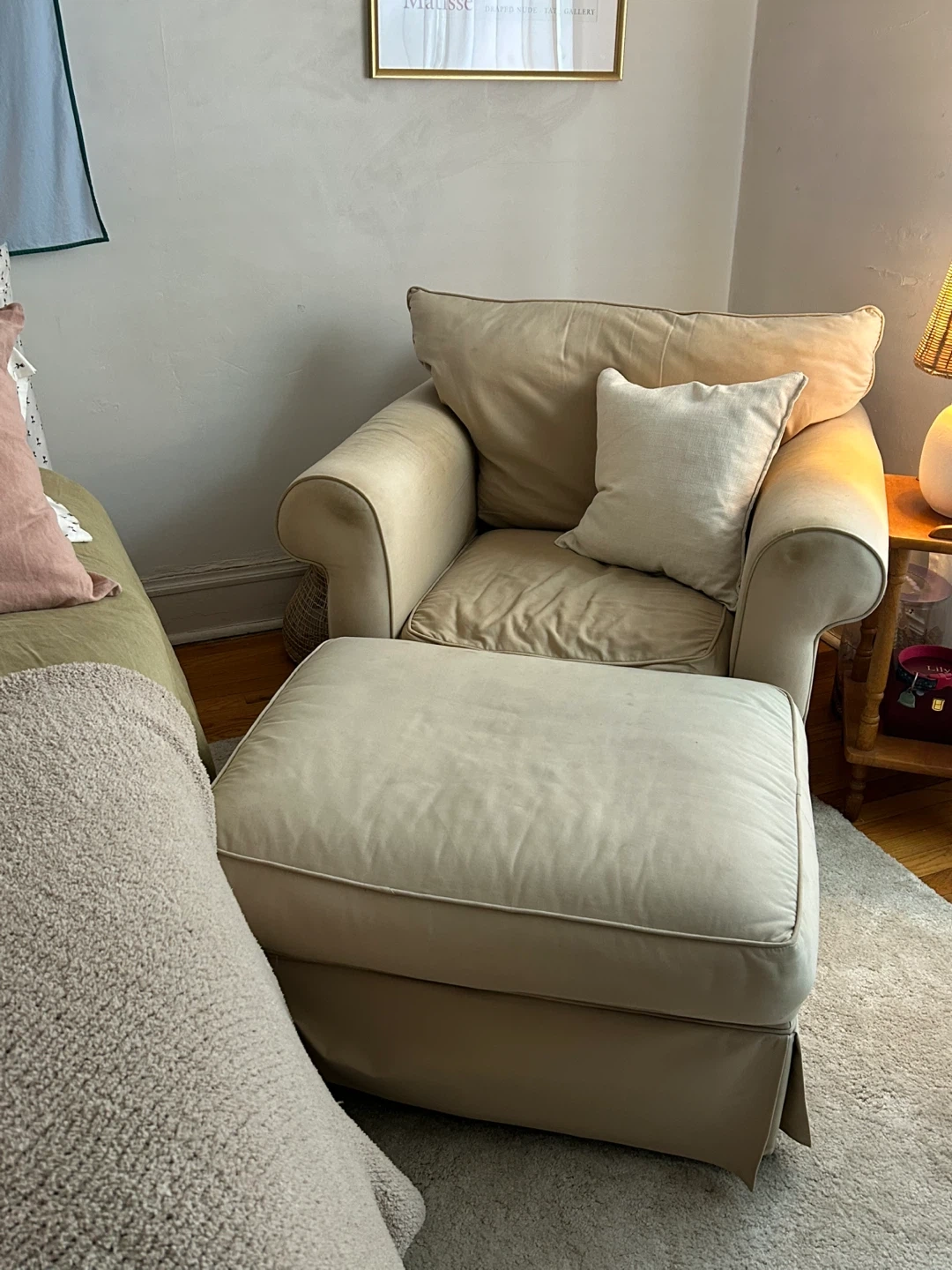 Comfortable light beige armchair with a matching ottoman. Manufactured by Klaussner Furniture Industries. Has been loved for many years, but is the perfect reading chair. Stained & heavily loved as shown above in the photos. Priced accordingly.