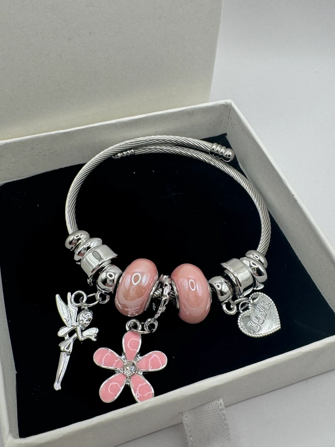This charm bracelet comes with a box! It features a silver-tone twisted cable bracelet adorned with various charms, including a fairy, a pink flower, a heart with 'LOVE' inscribed, and pink beads