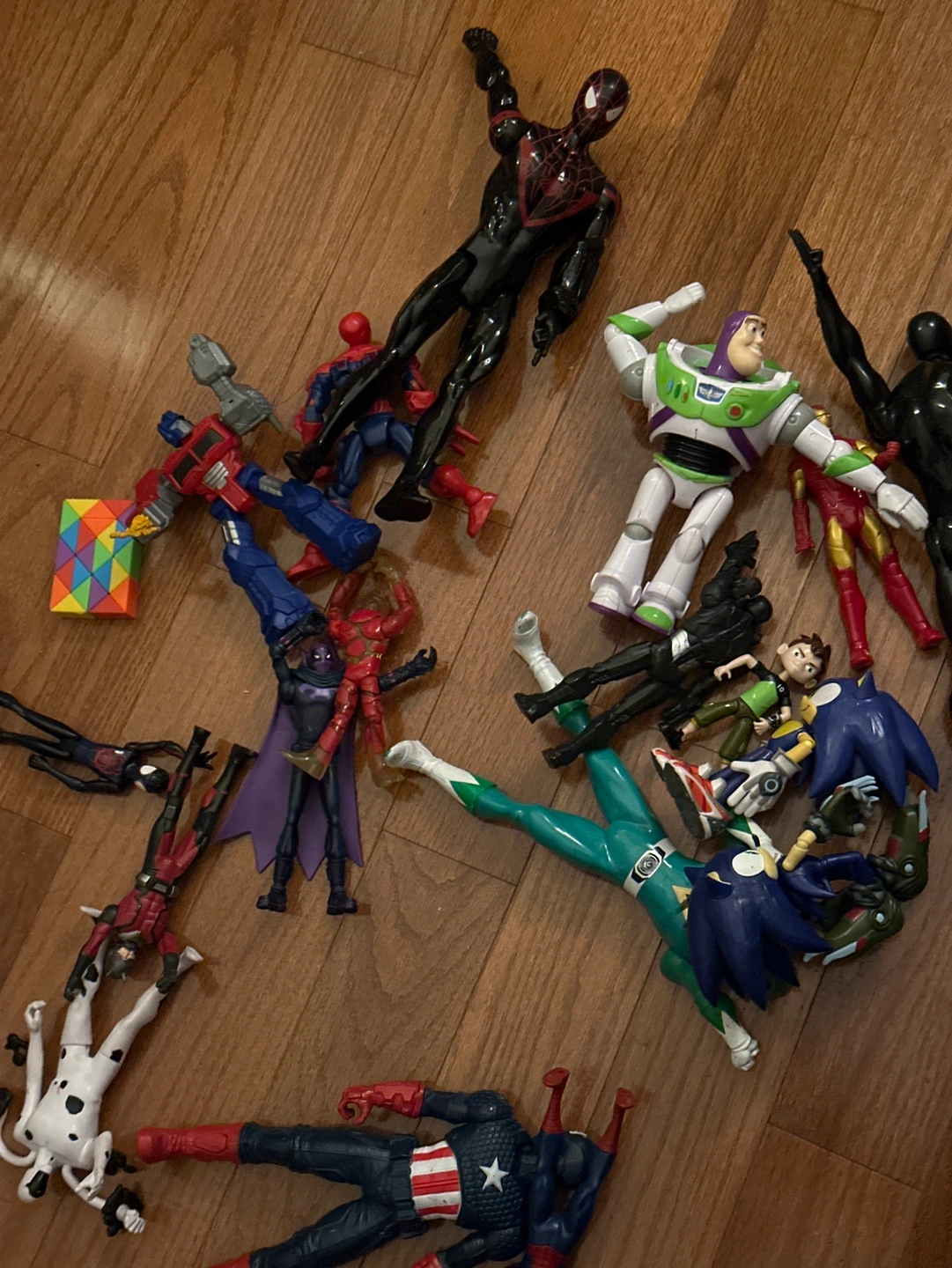 A lot of action figures including Spiderman, Iron Man, Captain America, Buzz Lightyear, Sonic the Hedgehog, and more. Figures are in used condition with some showing signs of wear. No original packaging.