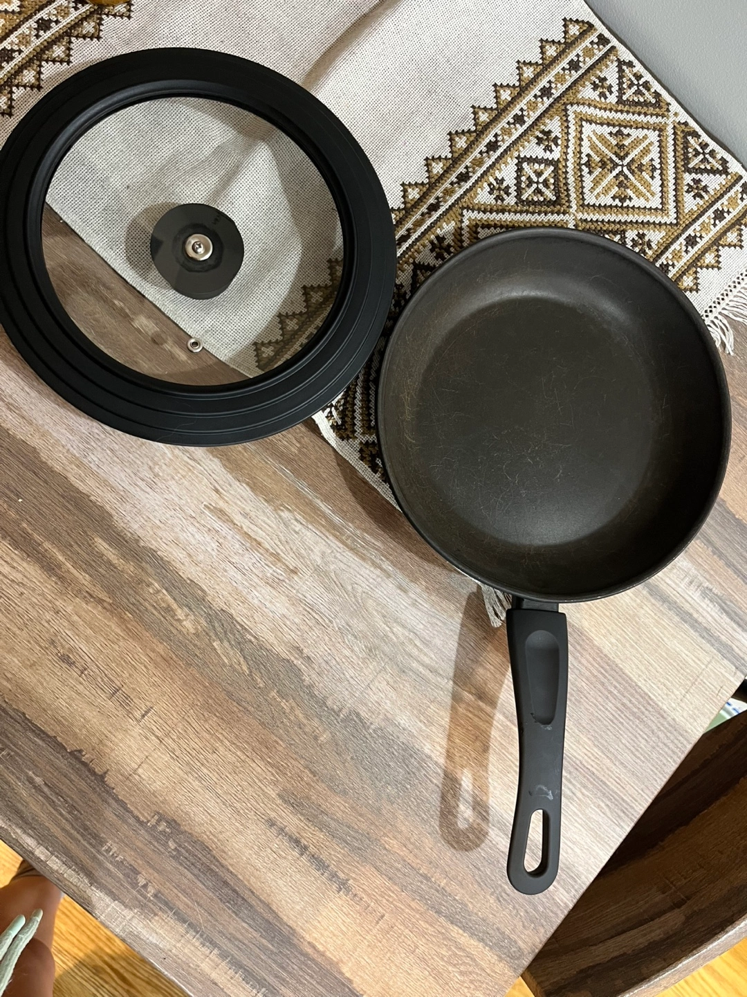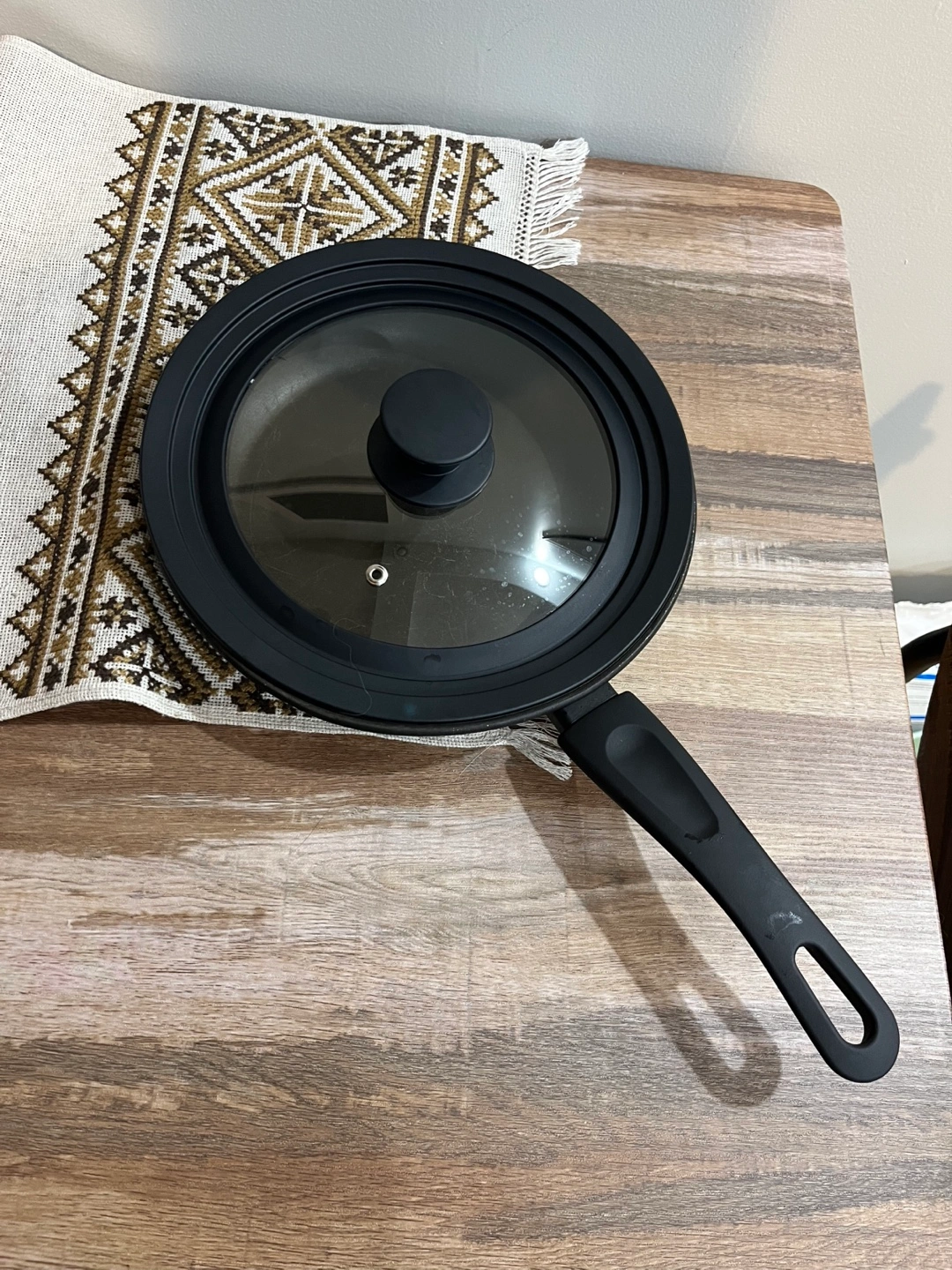 10 inch black frying pan. Non-stick surface. Includes glass lid. Great for cooking eggs or pancakes.