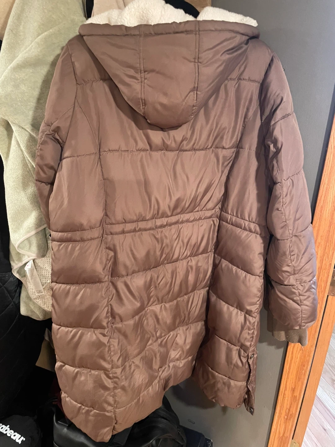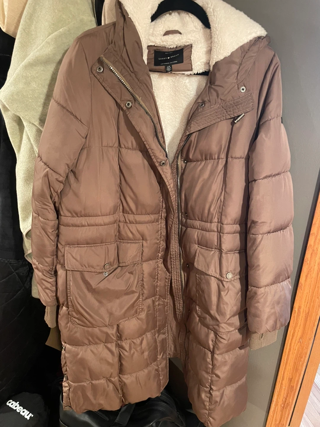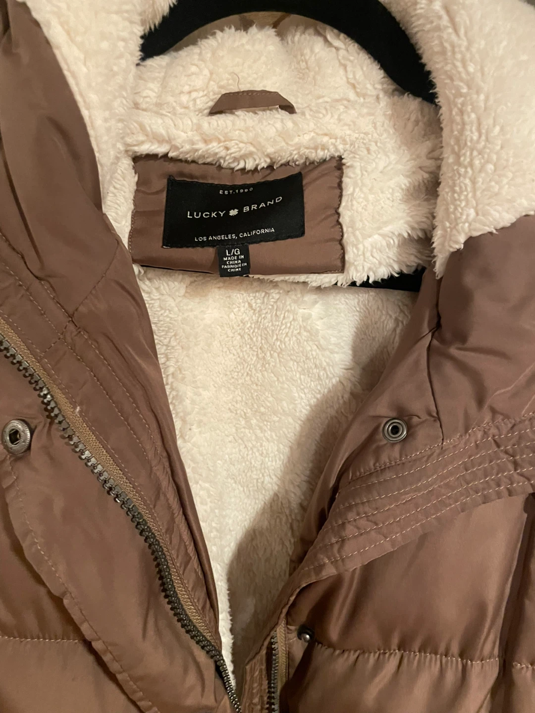 This is a brown Lucky Brand puffer coat with a sherpa lining. It's a size large and has a hood. The coat is quilted for warmth.
