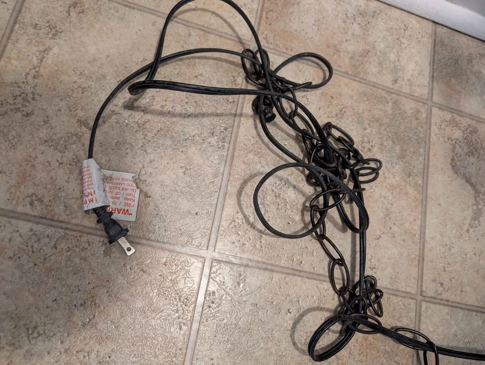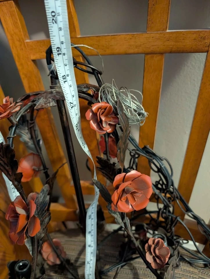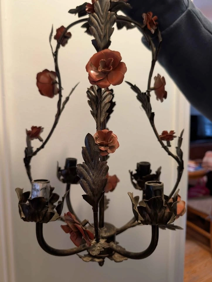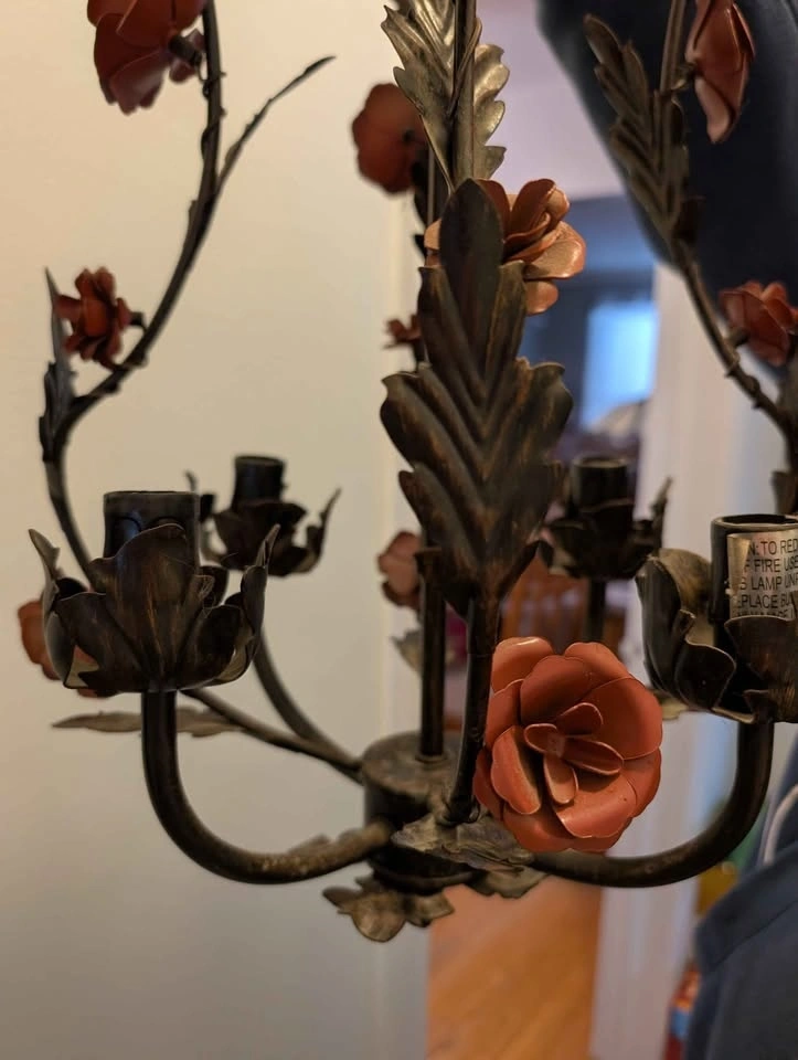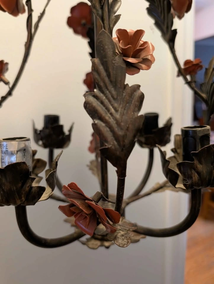 Vintage 1960 Metal Tolle painted 19" Chandelier. Black, bronze and dusty rose Tolle paint. Requires mini chandelier lights. 12 foot cord/ chain. Pick up at Victoria Park and St Clair.