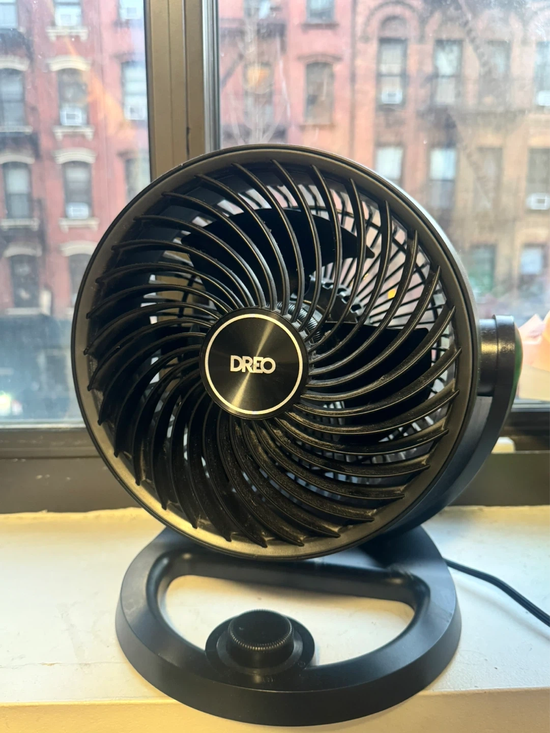 This is a compact black table fan from Dreo. It's a portable fan with a sturdy base and an easy-to-use control knob. It provides personal cooling for a desk or small space.