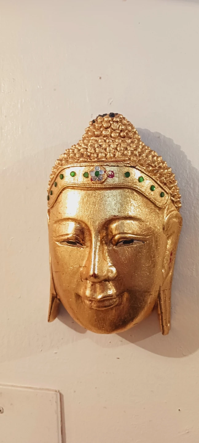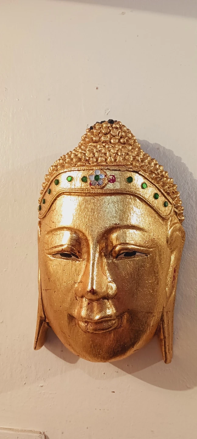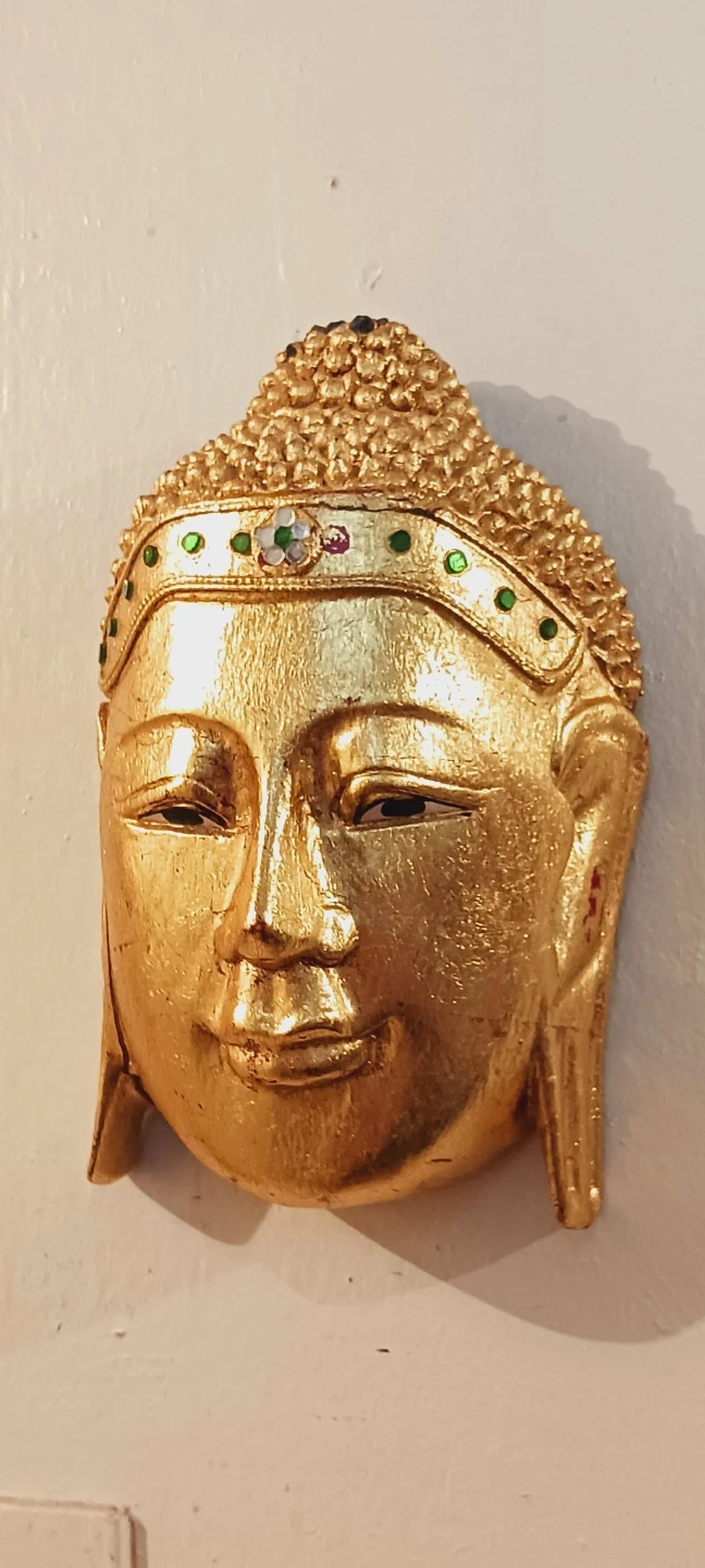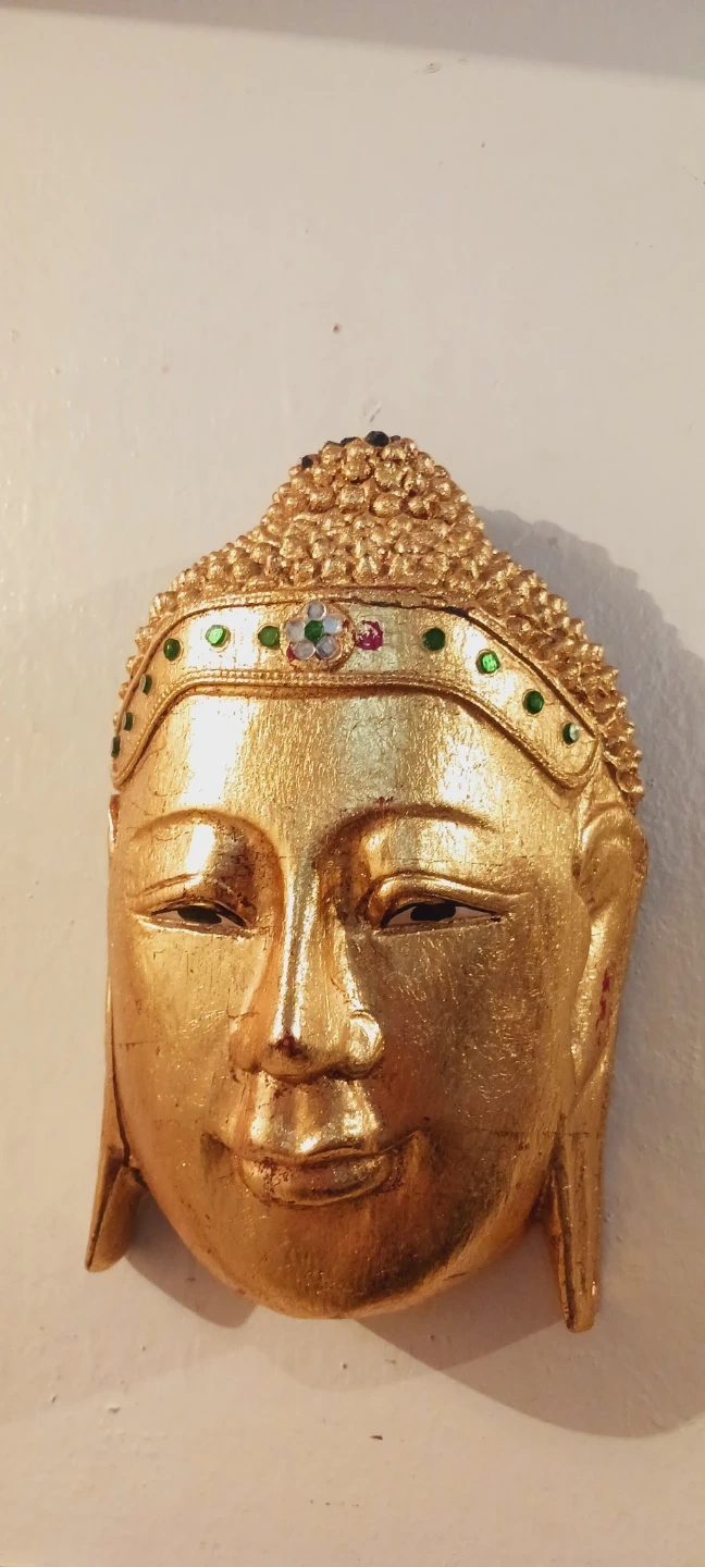 Beautiful Vintage Handcrafted Gold Gilt Wood Buddha Sakyamuni Peaceful Buddha Face Wall Decor. Decorative wall mask featuring a golden Buddha peacefull face. Accented with small green and colorful gems on the forehead band. A unique piece for home decor that brings peace and serenity to your home !!! 9"×6". Good condition. ALL MY PRICES ARE NEGOTIABLE !!