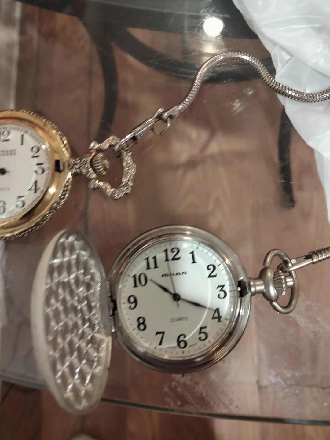This listing includes two pocket watches. One watch is silver-tone with a clean white dial and has 'Quartz' printed on it. The second watch is gold-tone with a white dial and also marked 'Quartz' and 'Japan'. Both watches have chains attached.