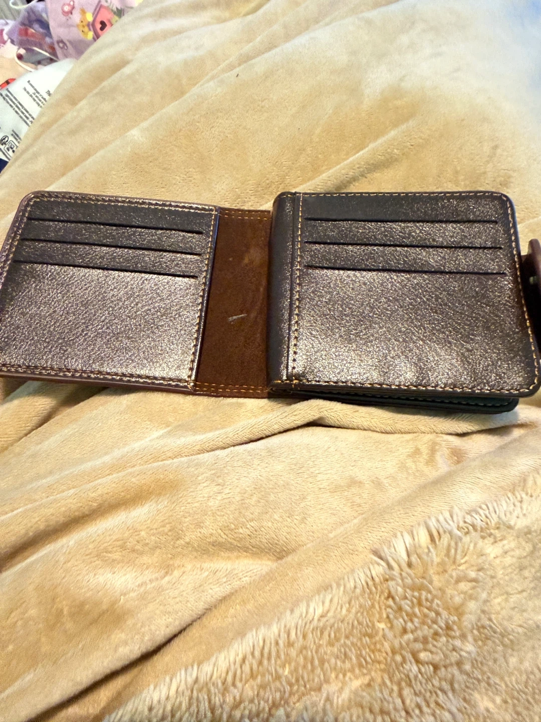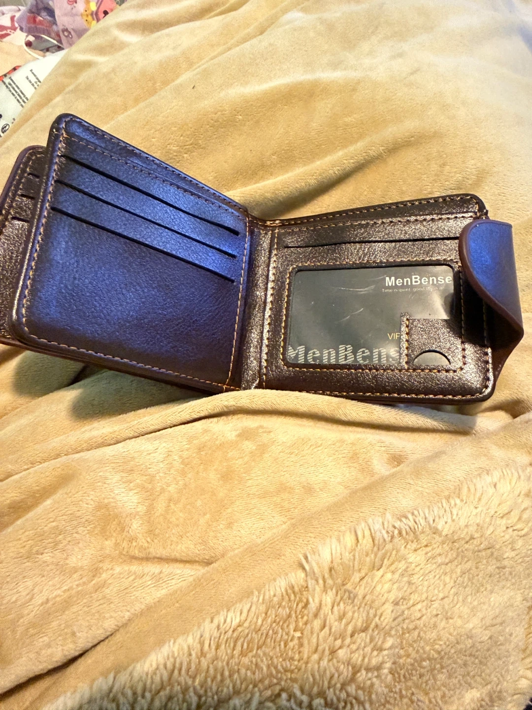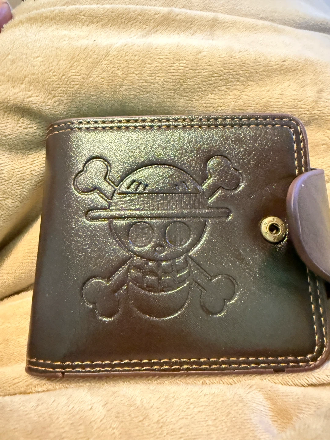 Brown bi-fold wallet from MenBense. It features a subtle debossed One Piece Jolly Roger design on the front. Multiple card slots and a clear ID window are included. Made of faux leather.