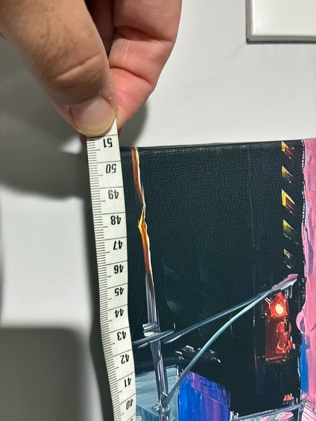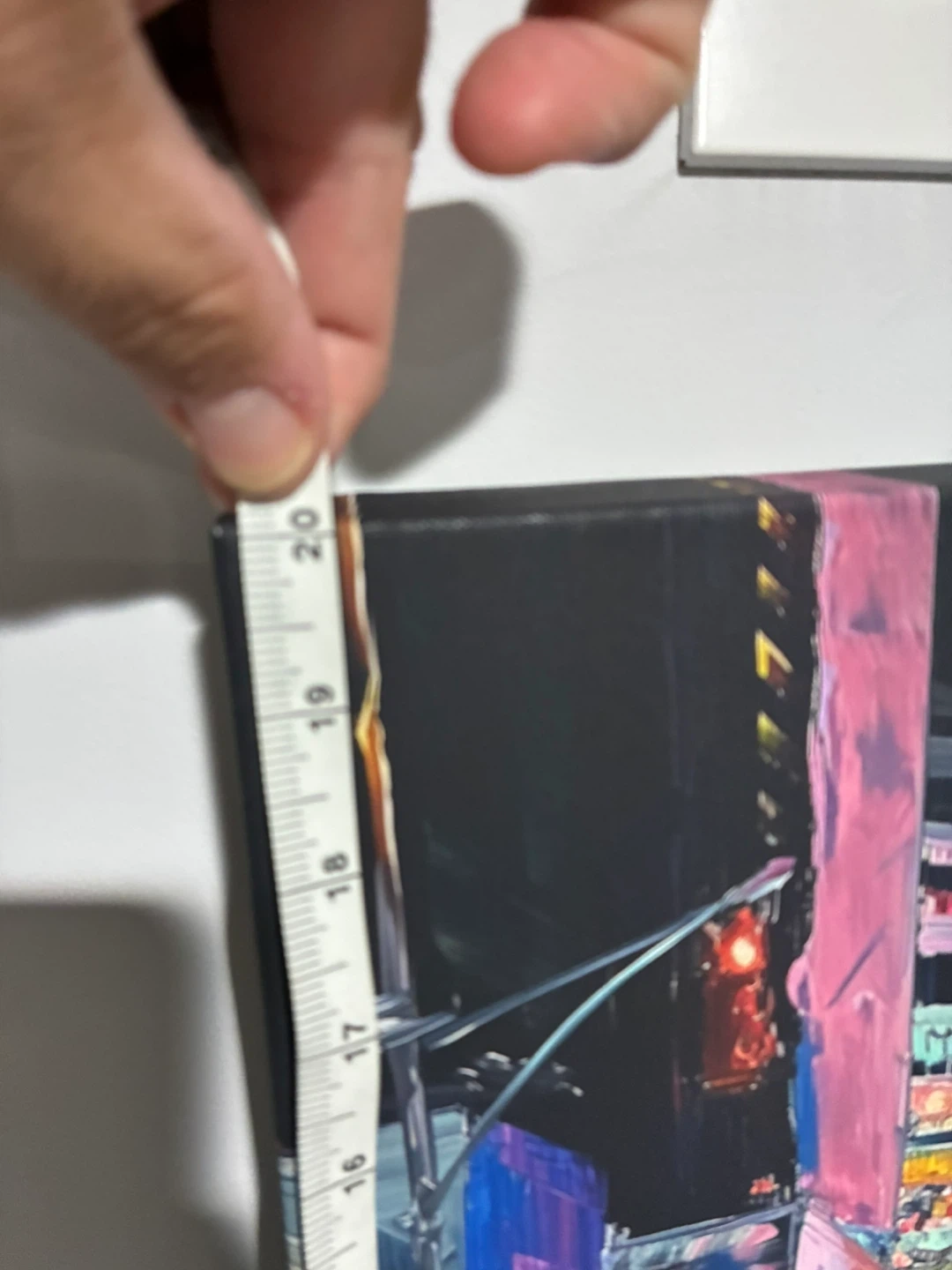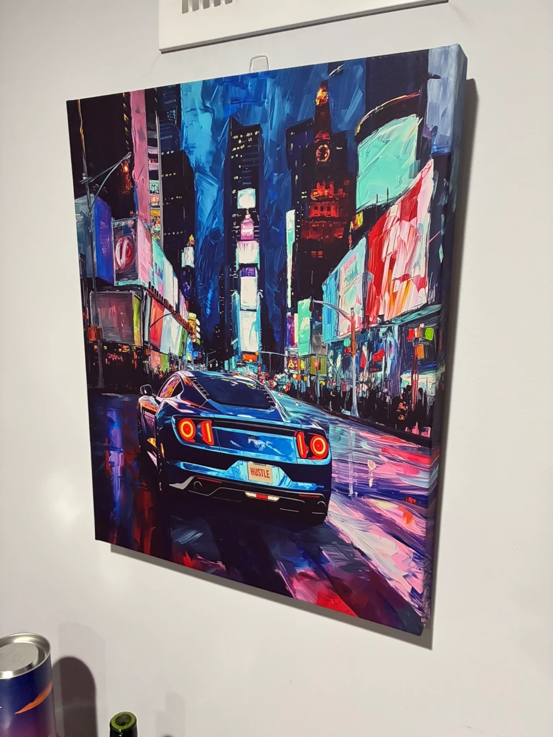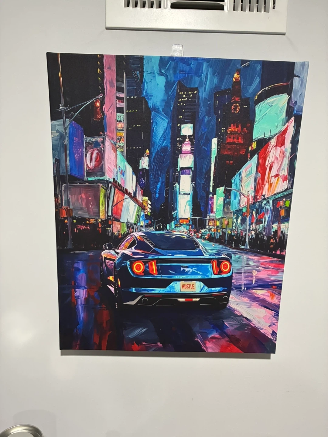 Canvas wall art featuring a cityscape with a car. It's in great condition and measures approximately 20 inches by 16 inches.