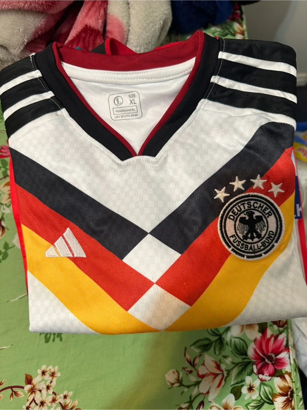 Germany national soccer jersey in size XL. Features the Adidas logo and the Deutscher Fussball-Bund crest. Made by Like Sports Wear.