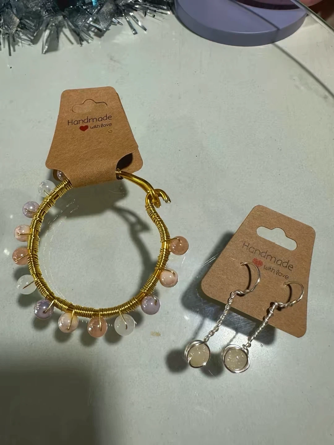 Selling a cute handmade jewelry set! It includes a bracelet and a pair of earrings, both crafted with love. The bracelet features a gold-colored wire and pastel-colored beads, while the earrings have a silver-colored wire and matching beads. Perfect for adding a touch of handmade charm to your style