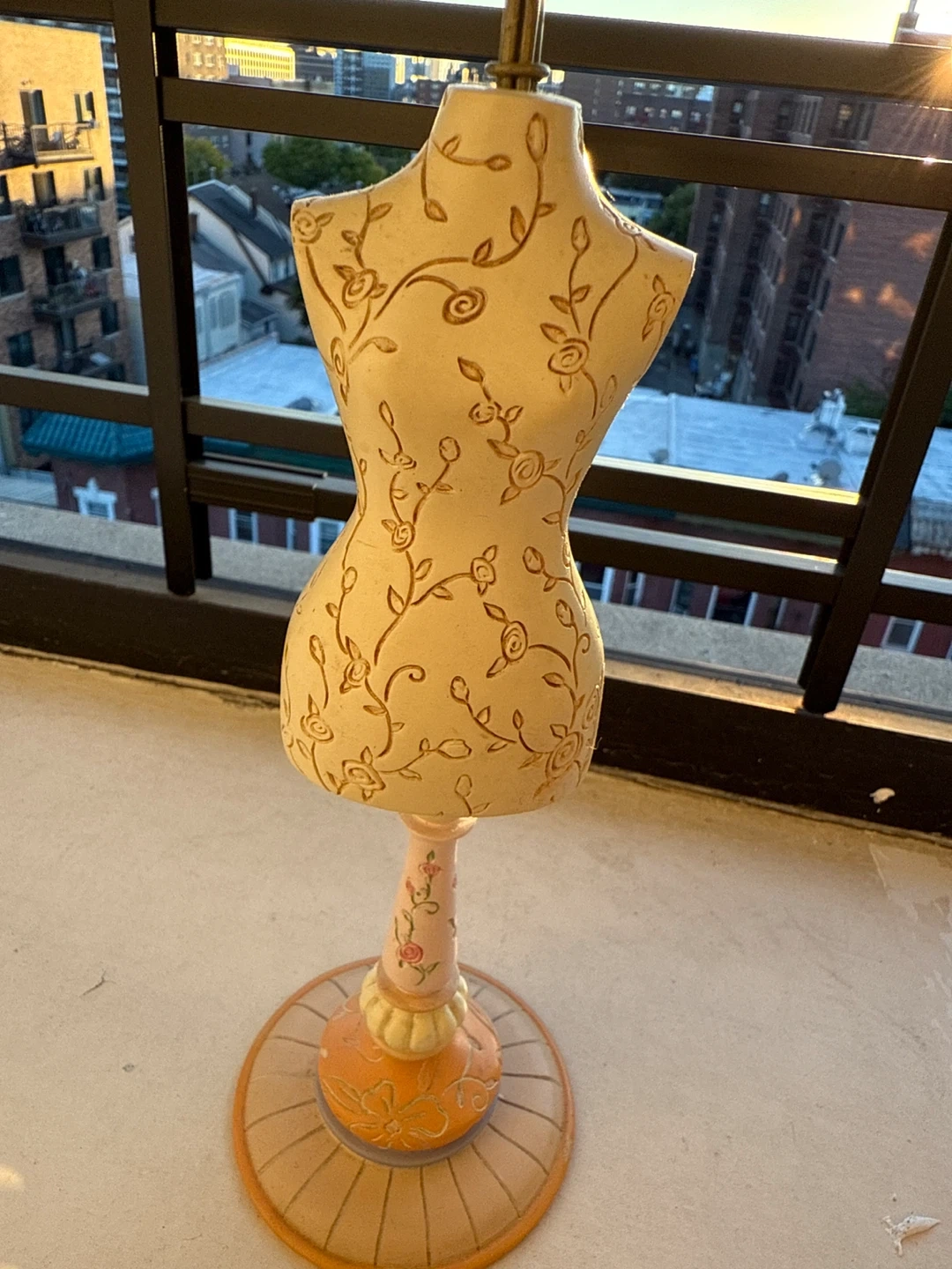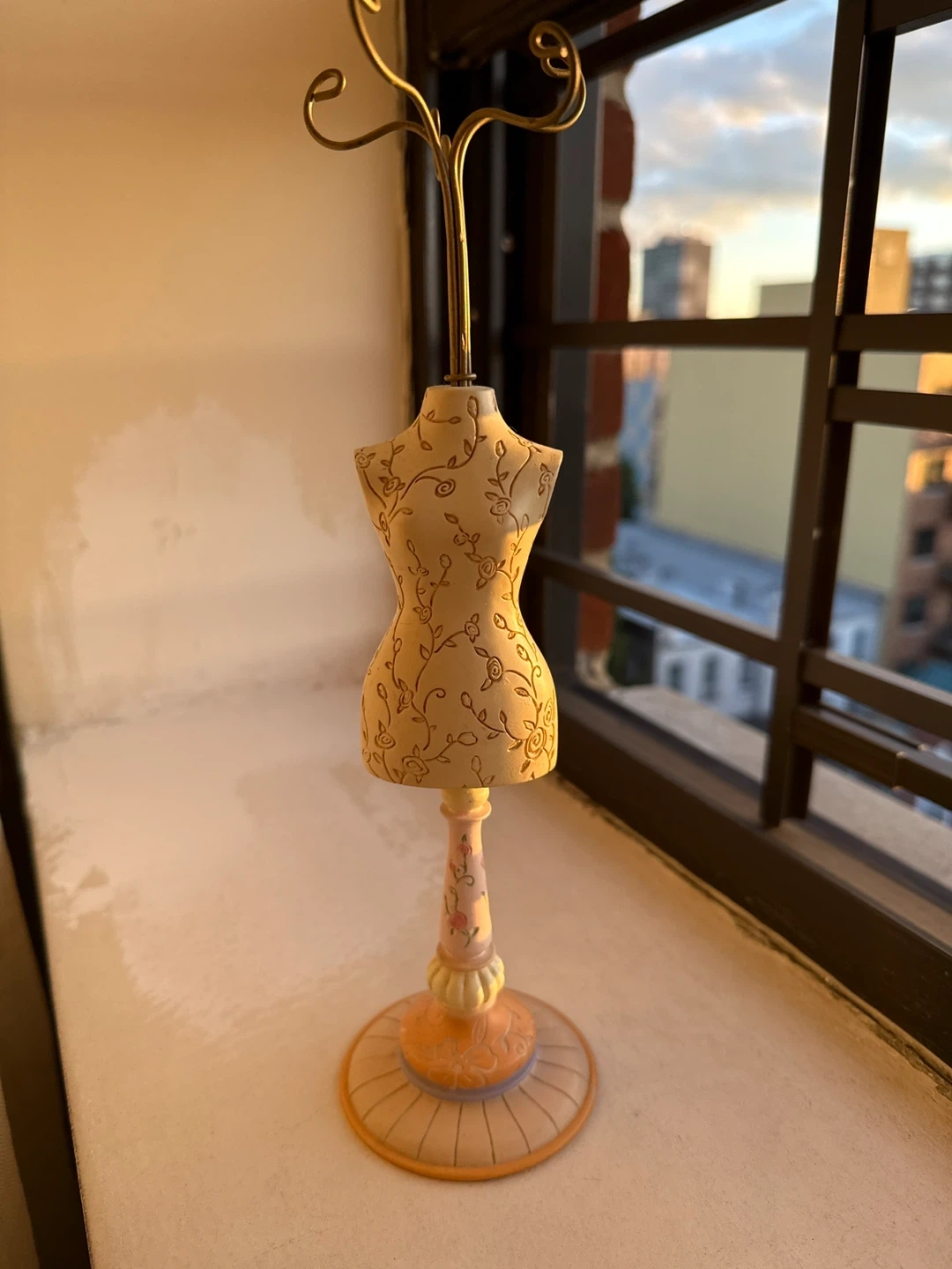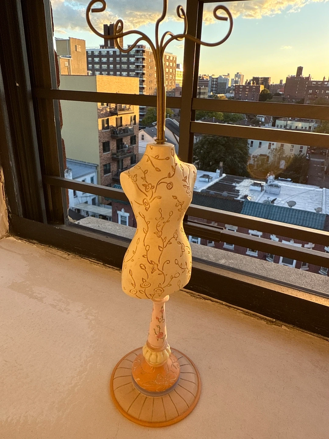 This is a decorative mannequin jewelry holder! It has a floral design on the mannequin body and a stand to hold jewelry. It's in great condition and ready to display your favorite pieces