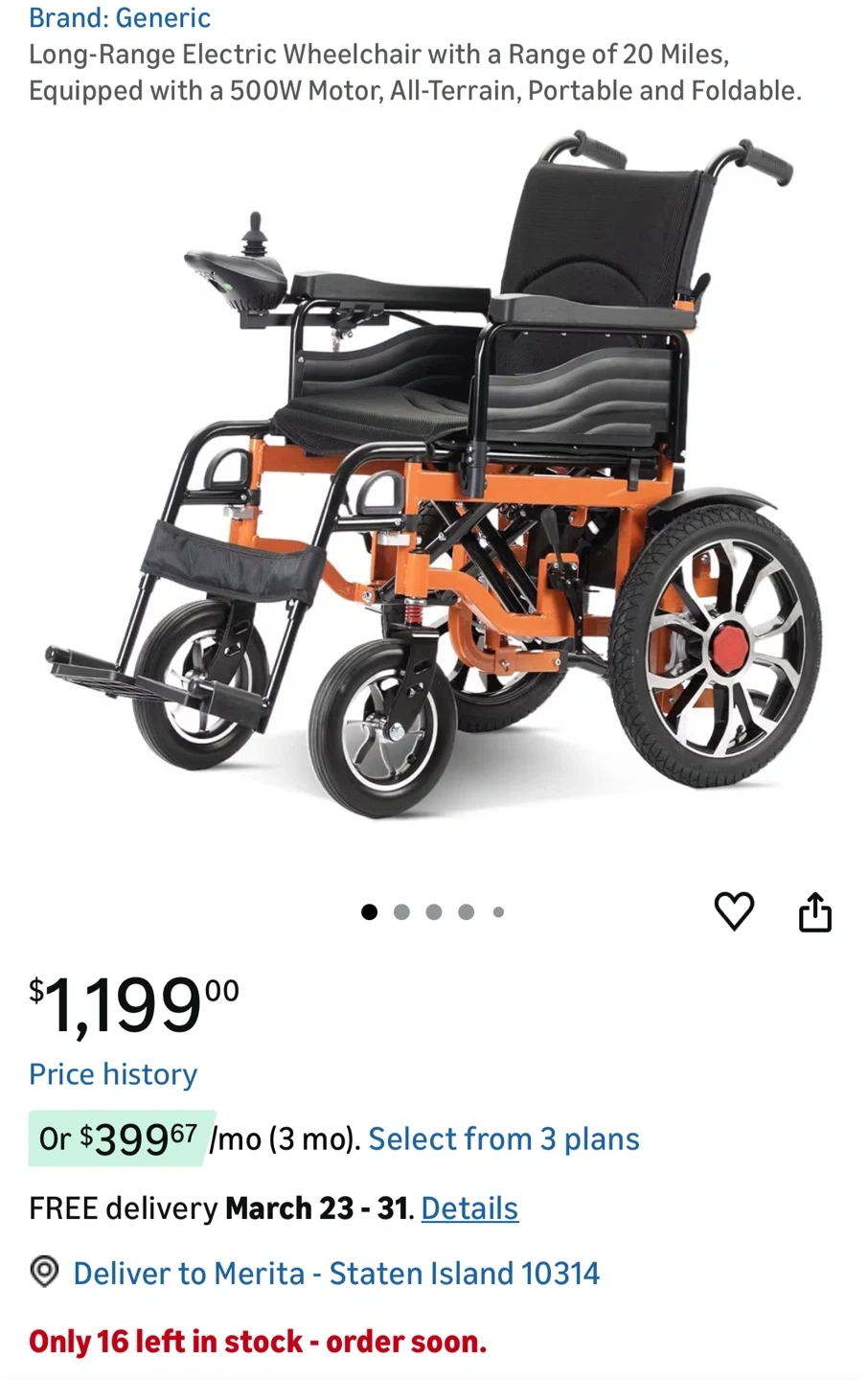 Electric wheelchair with a 20-mile range. It's equipped with a 500W motor and all-terrain capabilities. This wheelchair is portable and foldable, making it easy to transport. Contact me for more info π