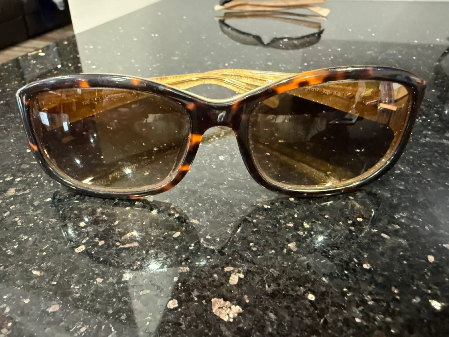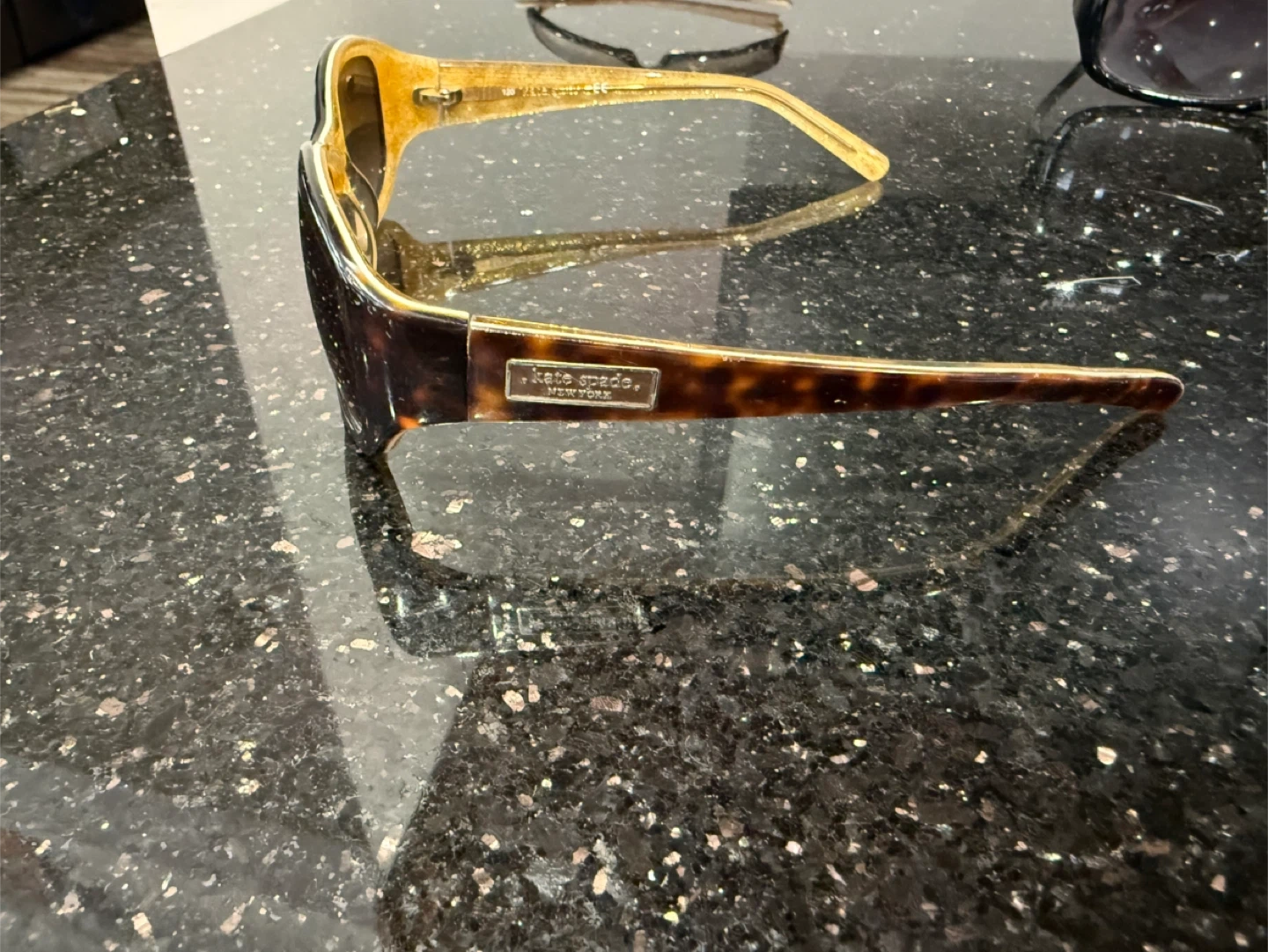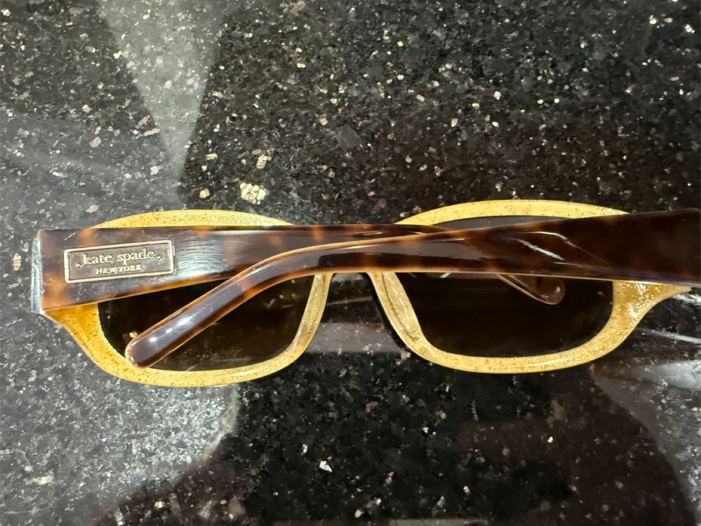 Stylish Kate Spade New York sunglasses with a tortoise shell and gold glitter frame. These offer a fashionable look for sunny days.