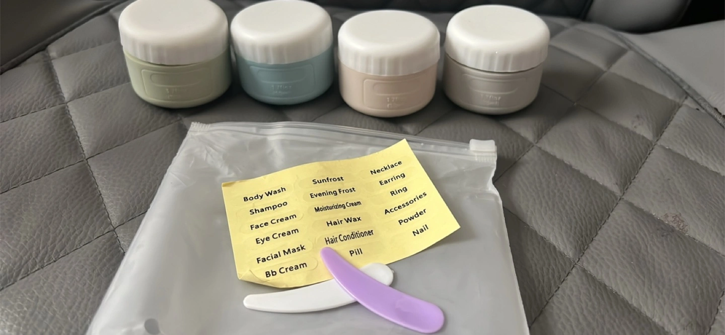 A set of cream jars in various colors. Includes a bag of labels. Also includes a spatula. Great for storing any of your travel essentials to bring on your next vacation.