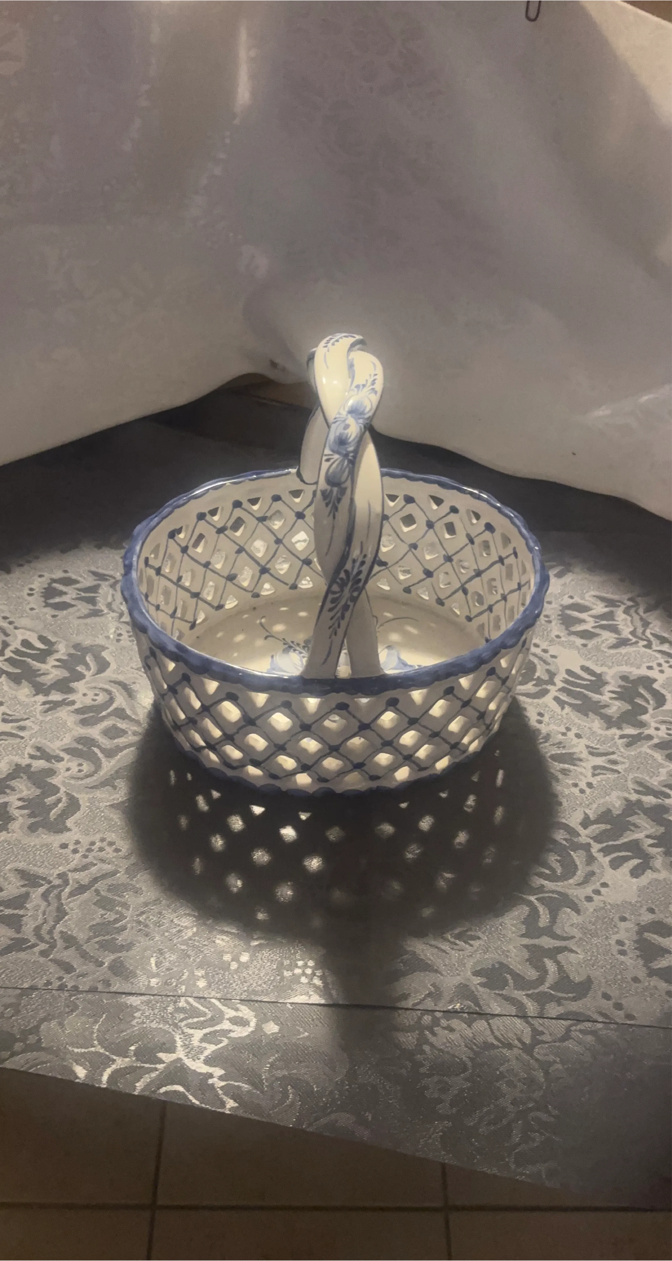 This is a beautiful ceramic basket with a decorative openwork design. It features a charming blue floral pattern and a twisted handle. Its decorative style makes it a lovely addition to home decor.