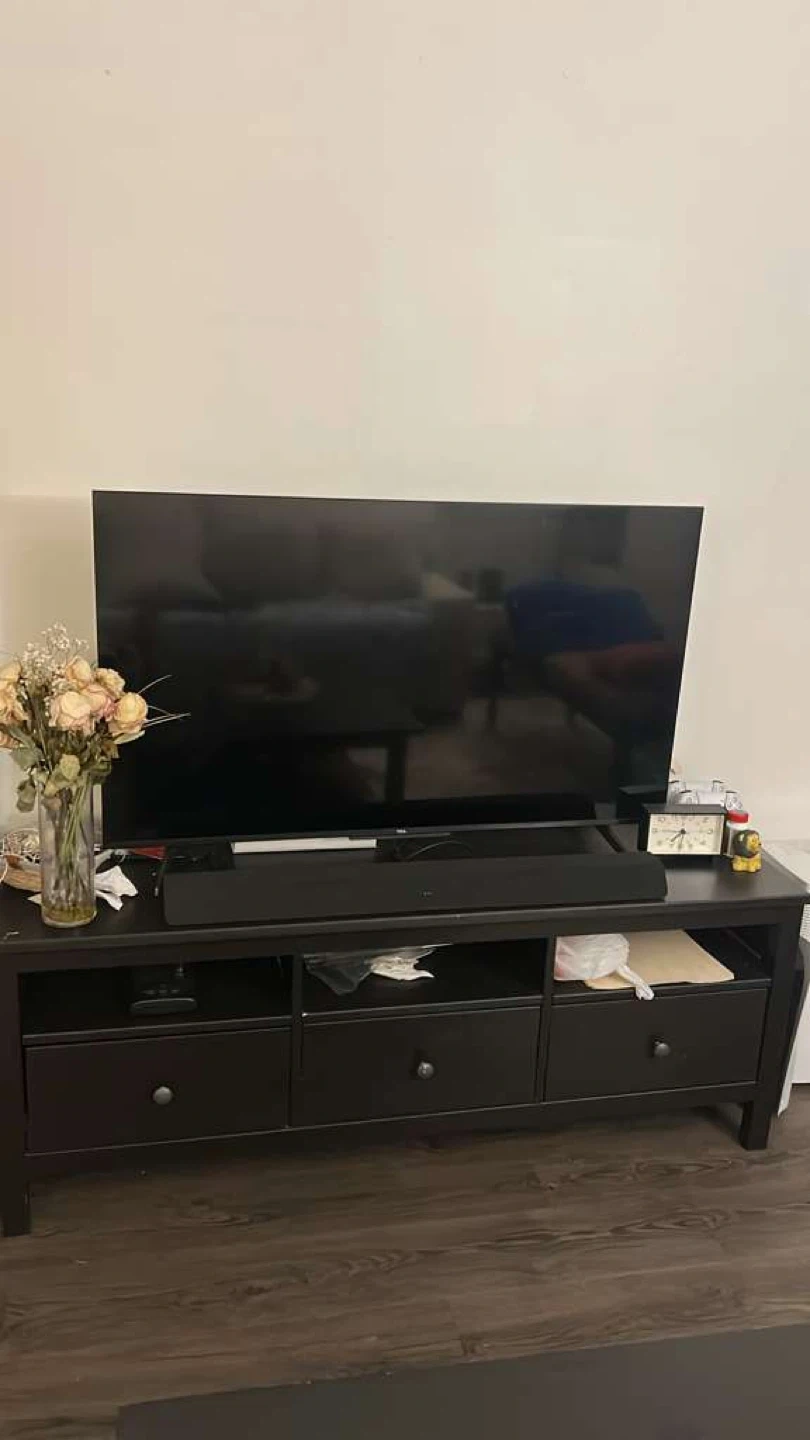 Selling a black TV stand or media console. It features drawers and open shelving for storage. Perfect for organizing your entertainment area!
