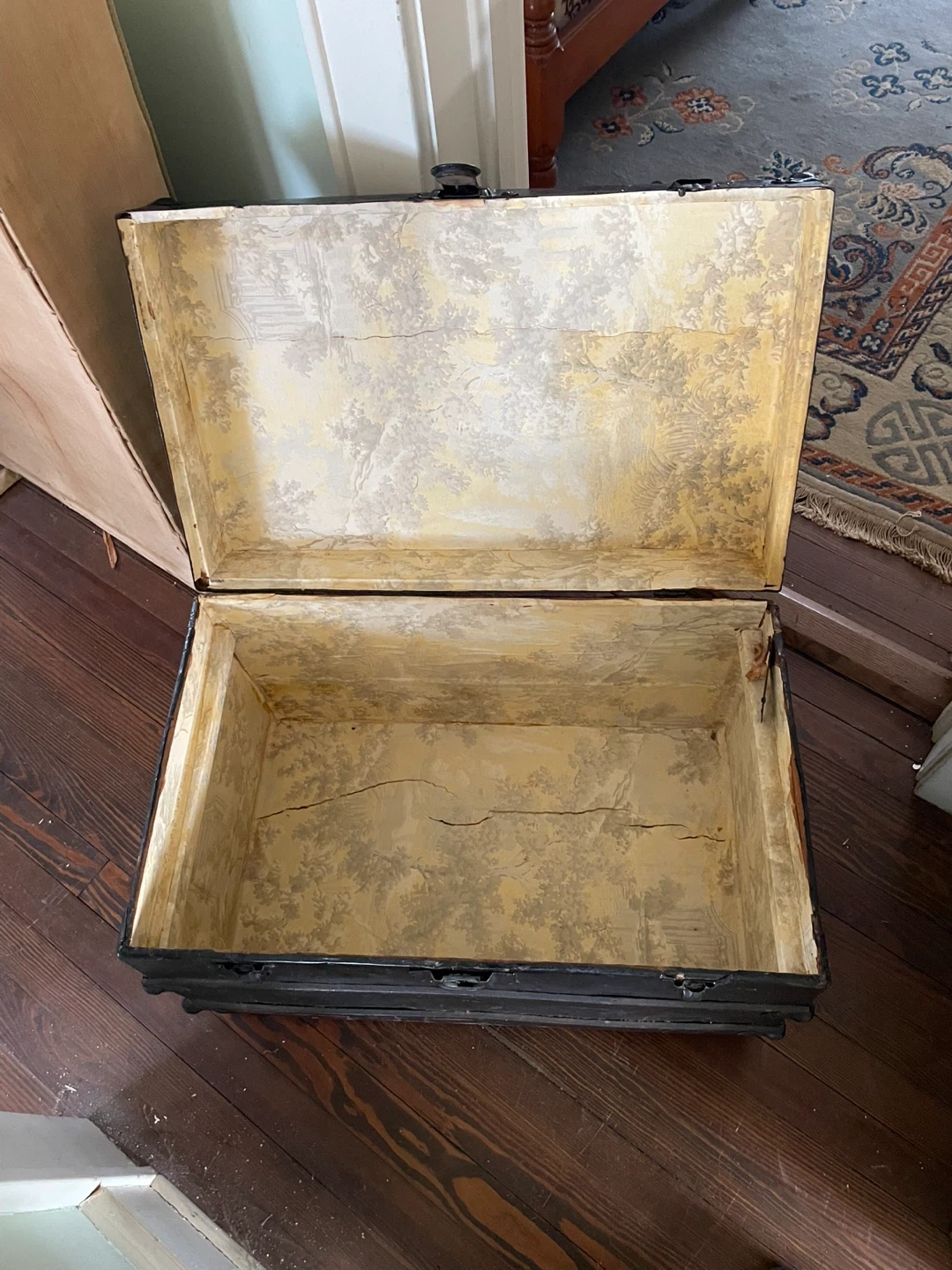 This vintage steamer trunk is black with a decorative lining inside. It's perfect for storage or as a decorative piece. Has metal latches and accents. Found at uncles house, selling to cover funeral expenses