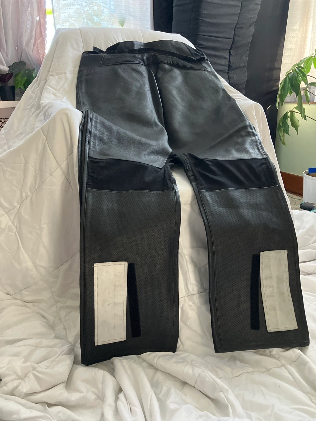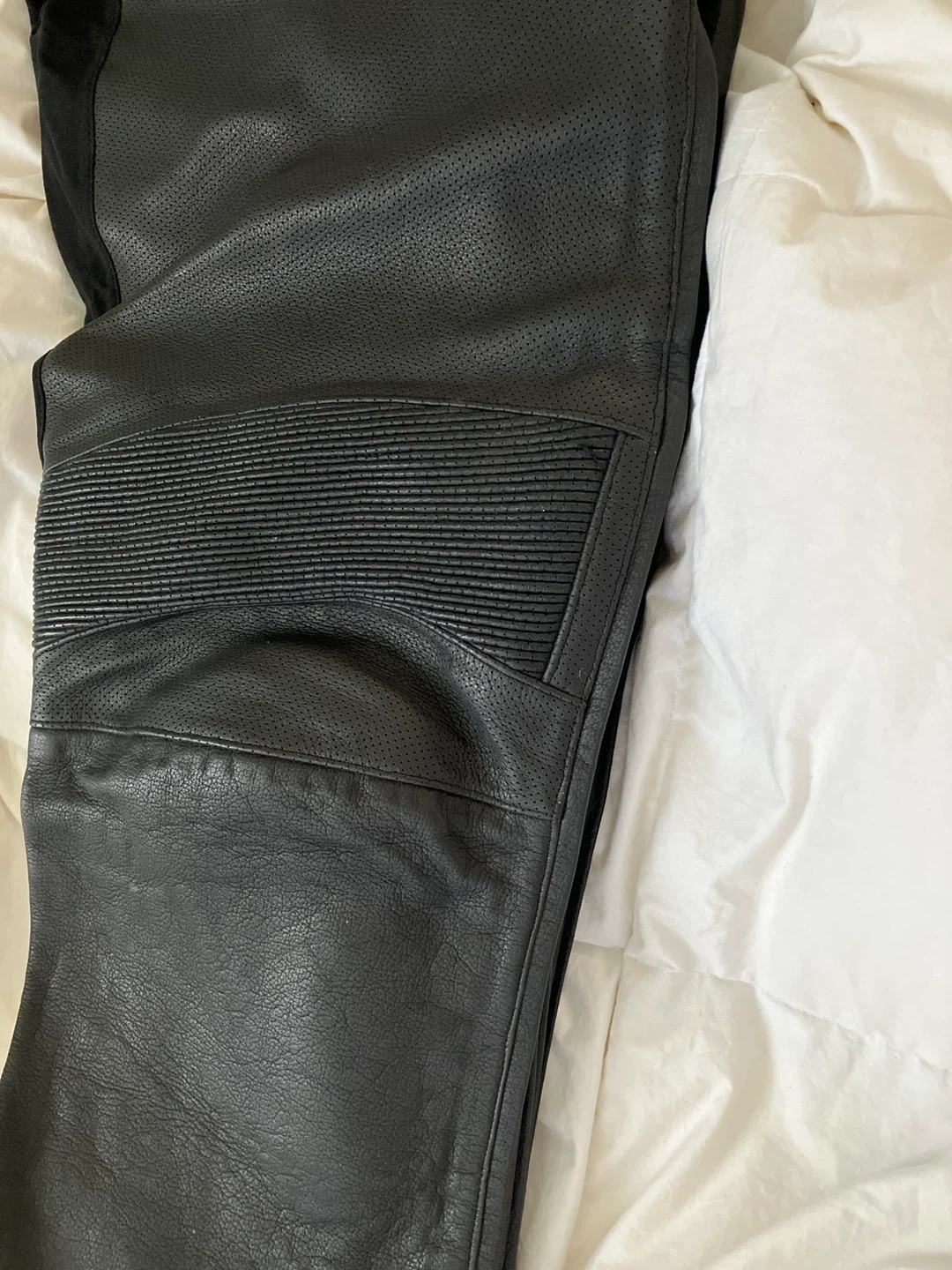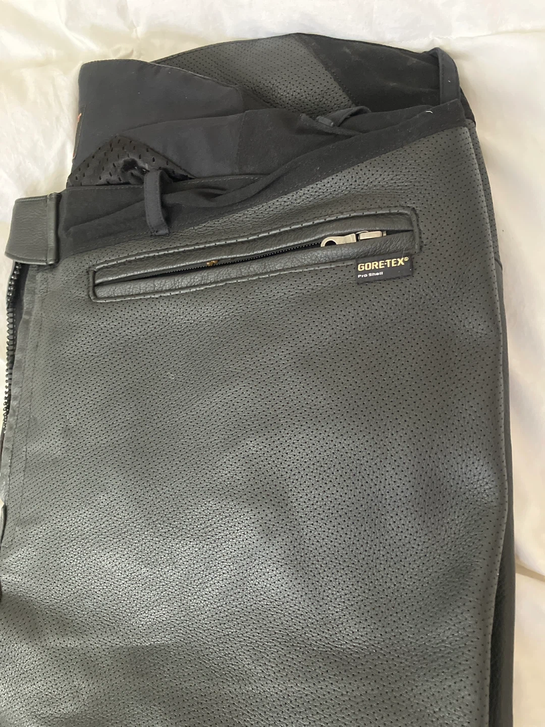 Black leather motorcycle pants with Gore-Tex Pro Shell technology. Features include perforated leather panels and ribbed knee protection. Guaranteed to keep you dry!