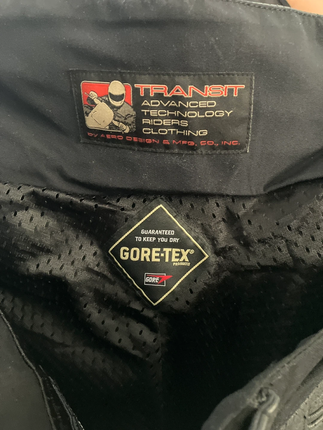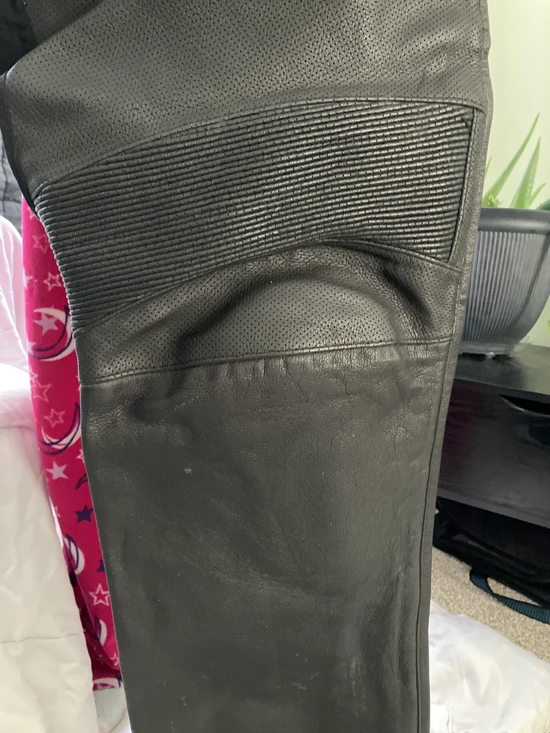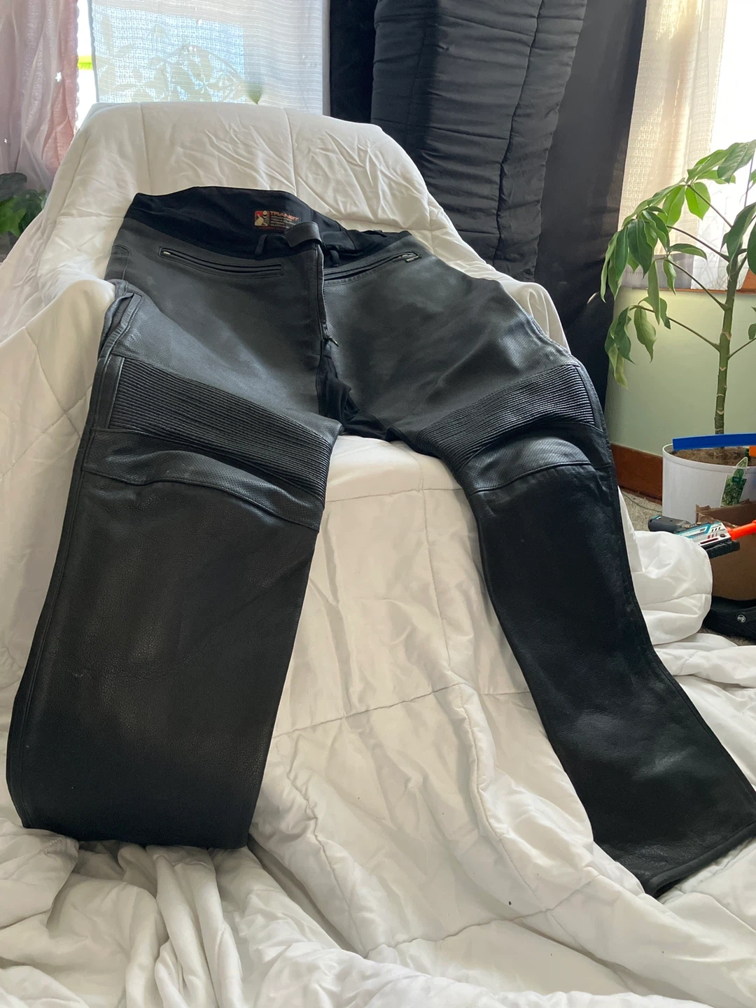 Black leather motorcycle pants with Gore-Tex Pro Shell technology. Features include perforated leather panels and ribbed knee protection. Guaranteed to keep you dry!