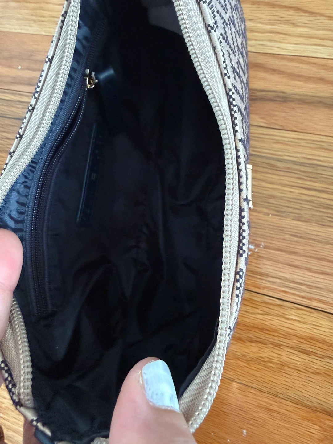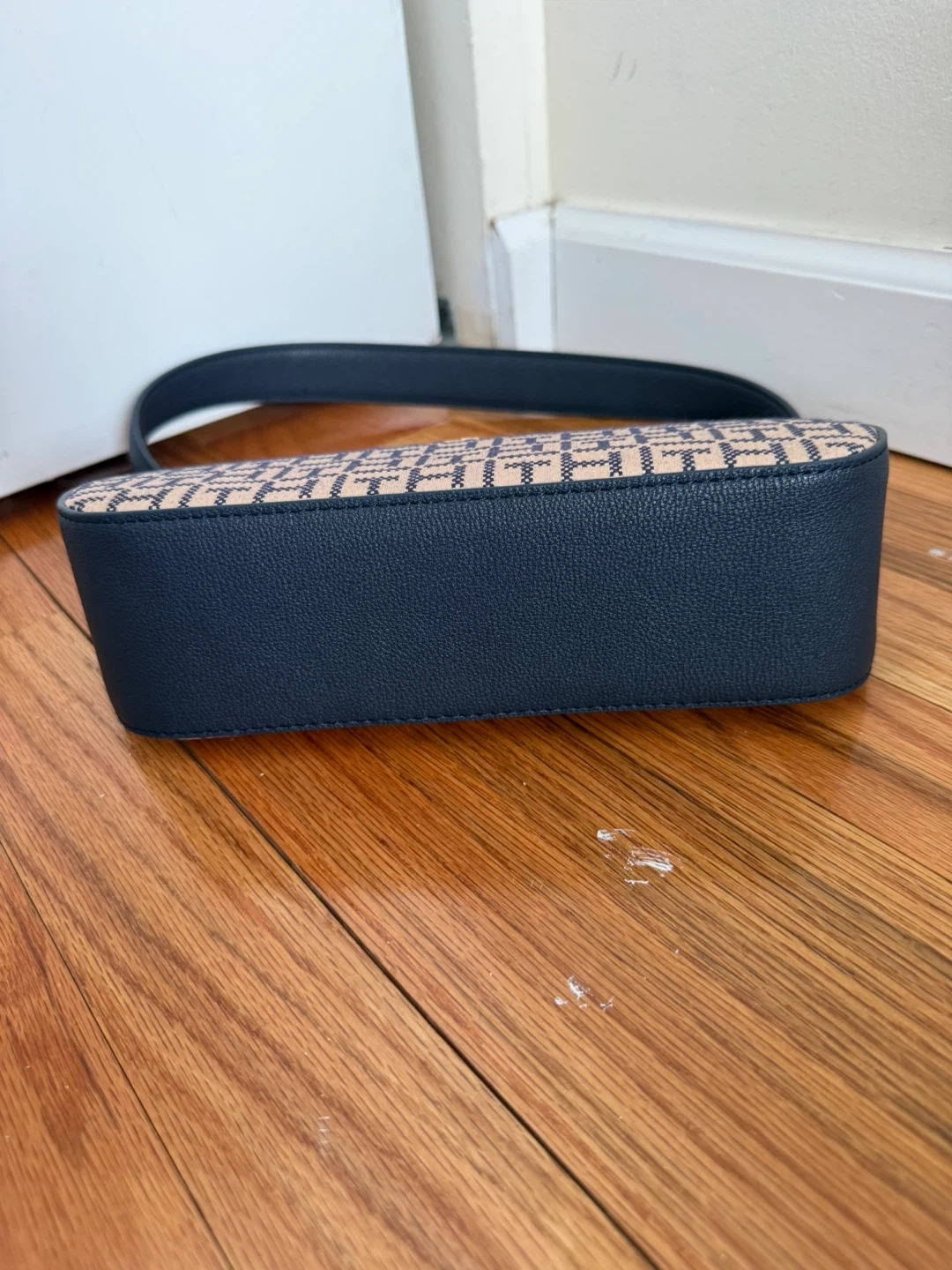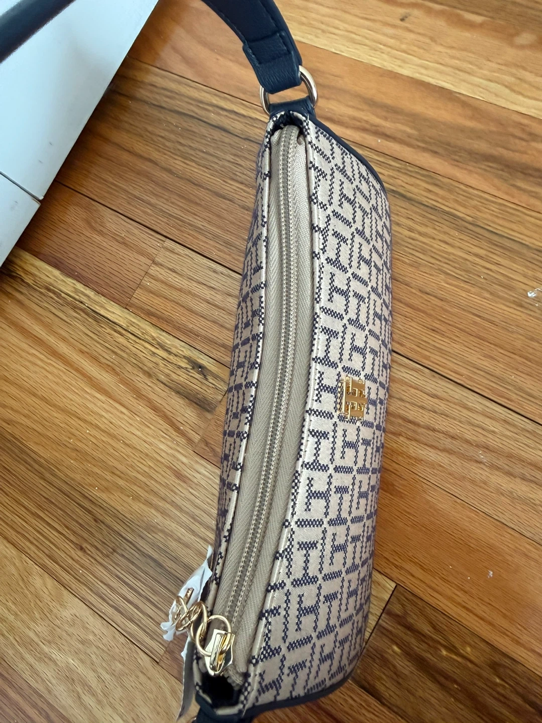 This is a classic Tommy Hilfiger shoulder bag with the signature monogram print. It features a zip closure and an interior zip pocket. The bag has a canvas exterior and faux leather trim.