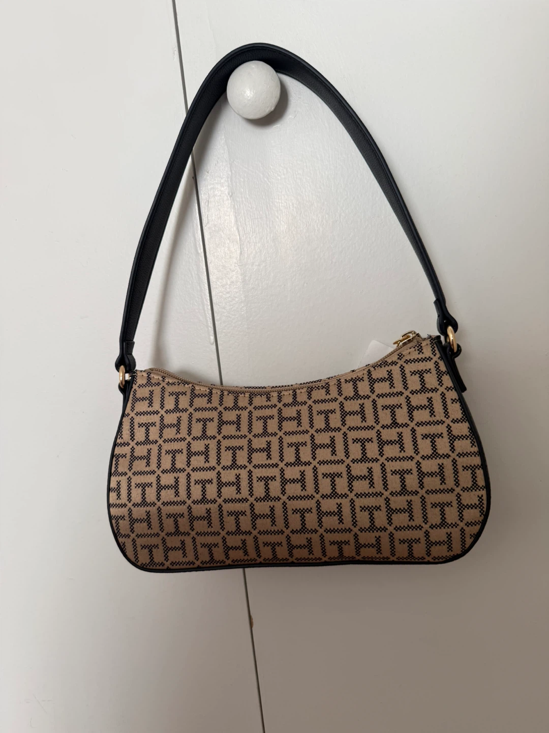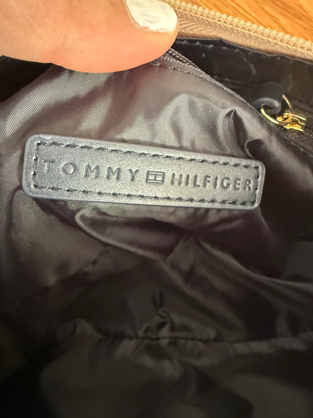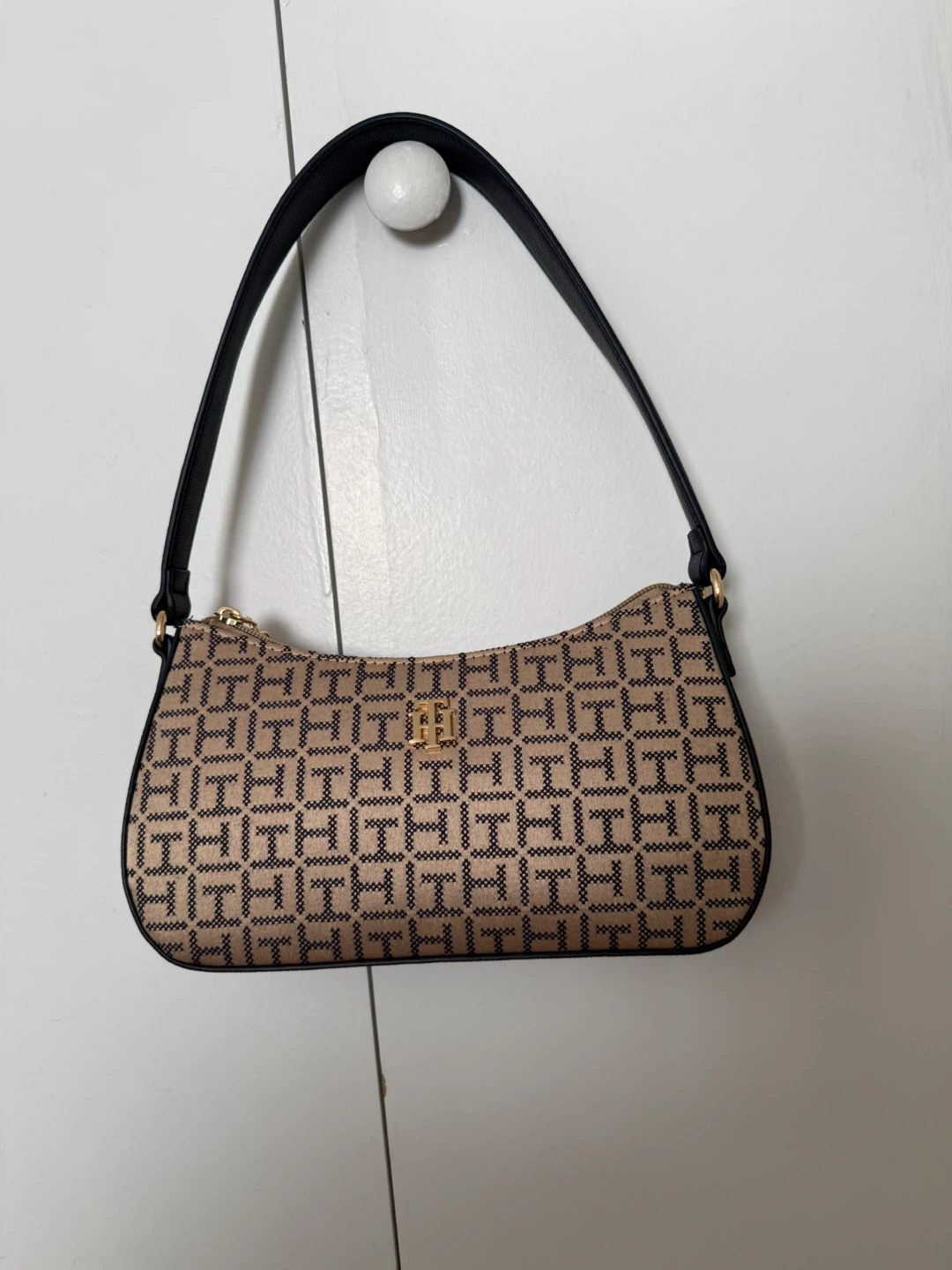 This is a classic Tommy Hilfiger shoulder bag with the signature monogram print. It features a zip closure and an interior zip pocket. The bag has a canvas exterior and faux leather trim.