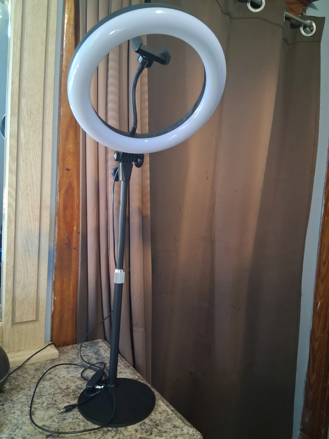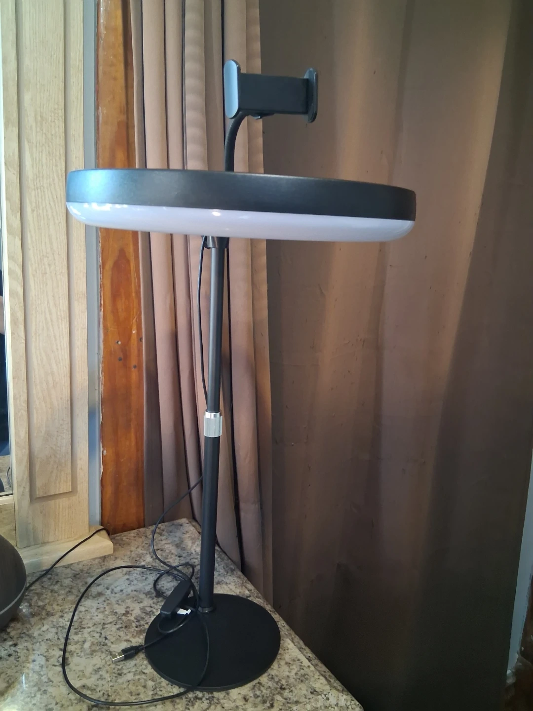 This is a ring light on a stand with an adjustable phone holder. It's great for content creation or video calls. The light has a built-in dimmer for brightness control. Does not extend. Approximately 18 inches tall.