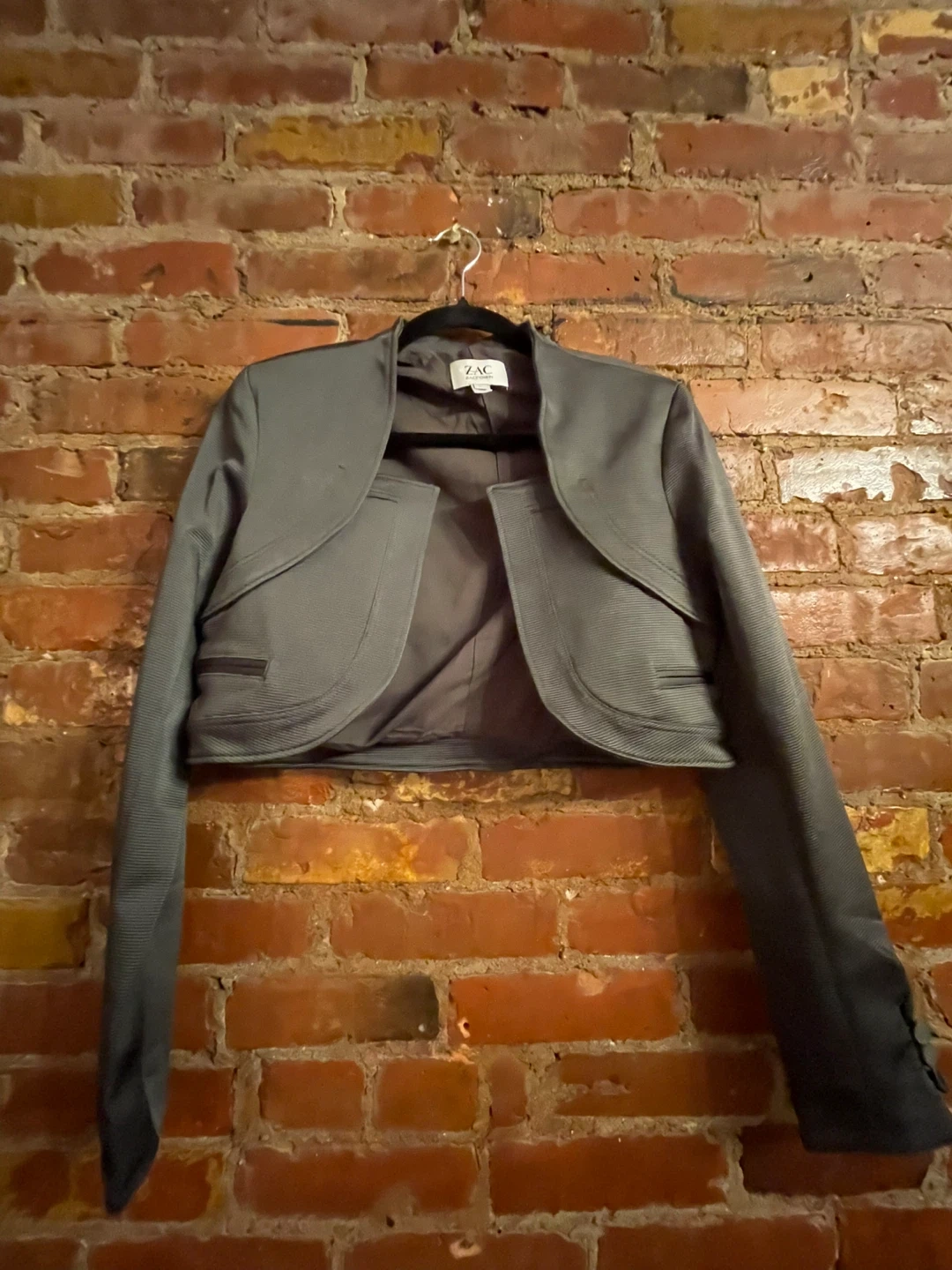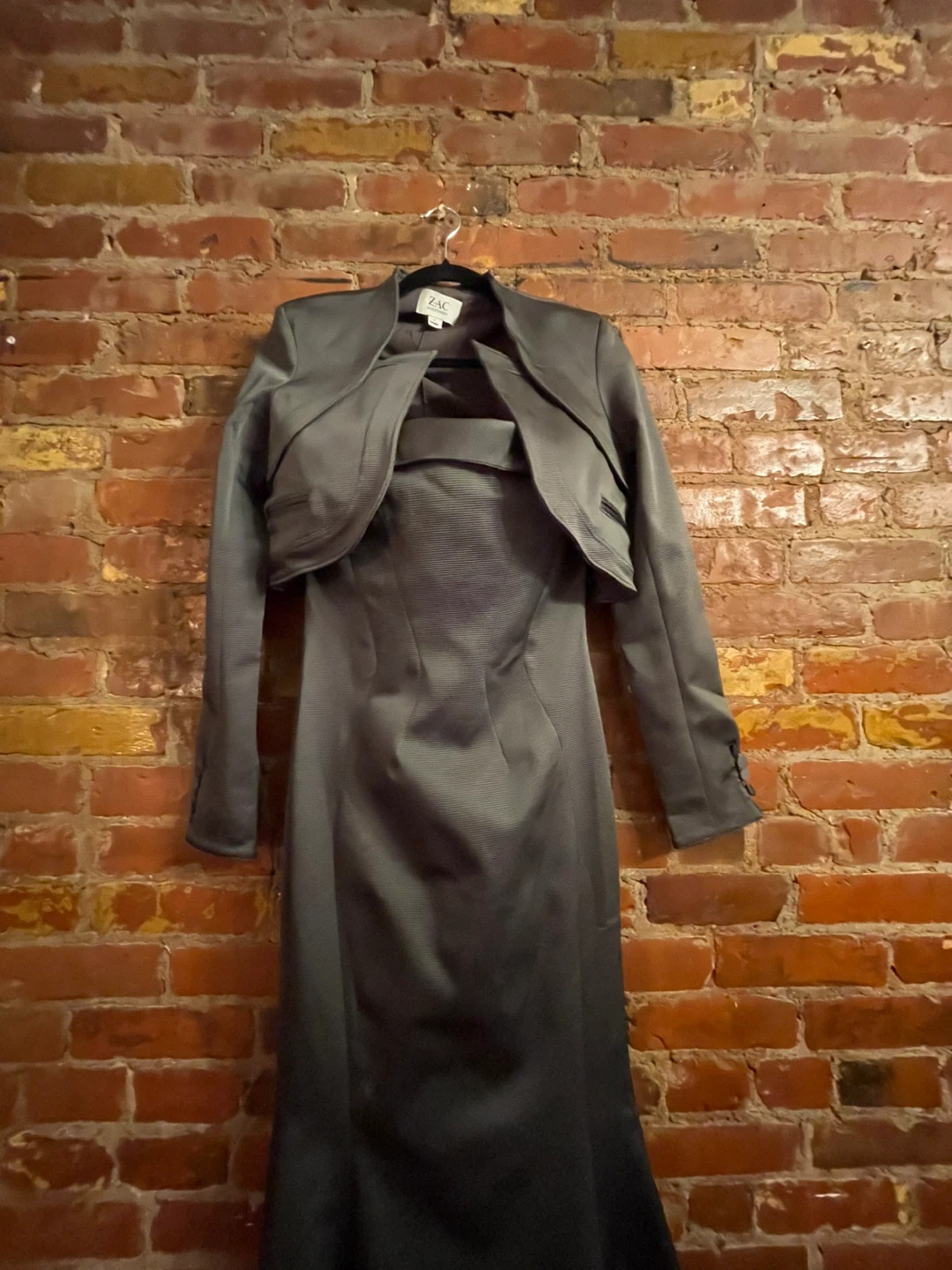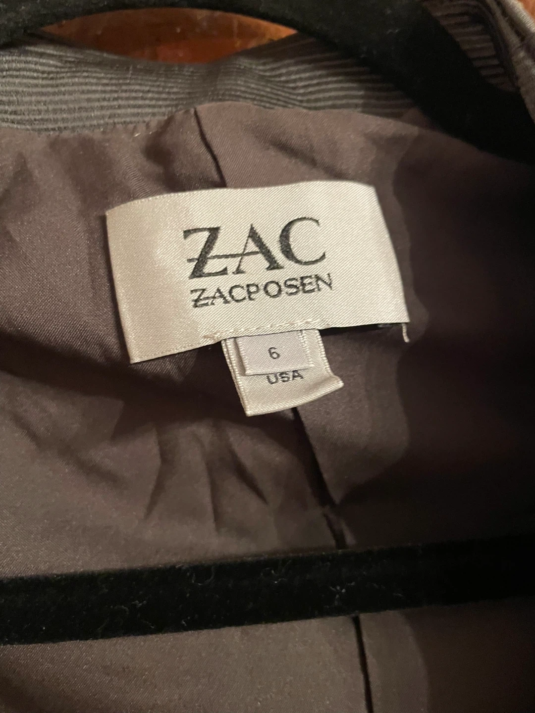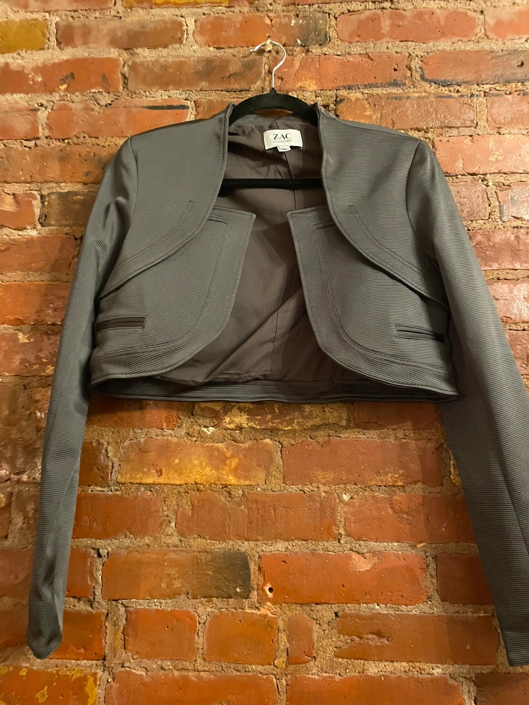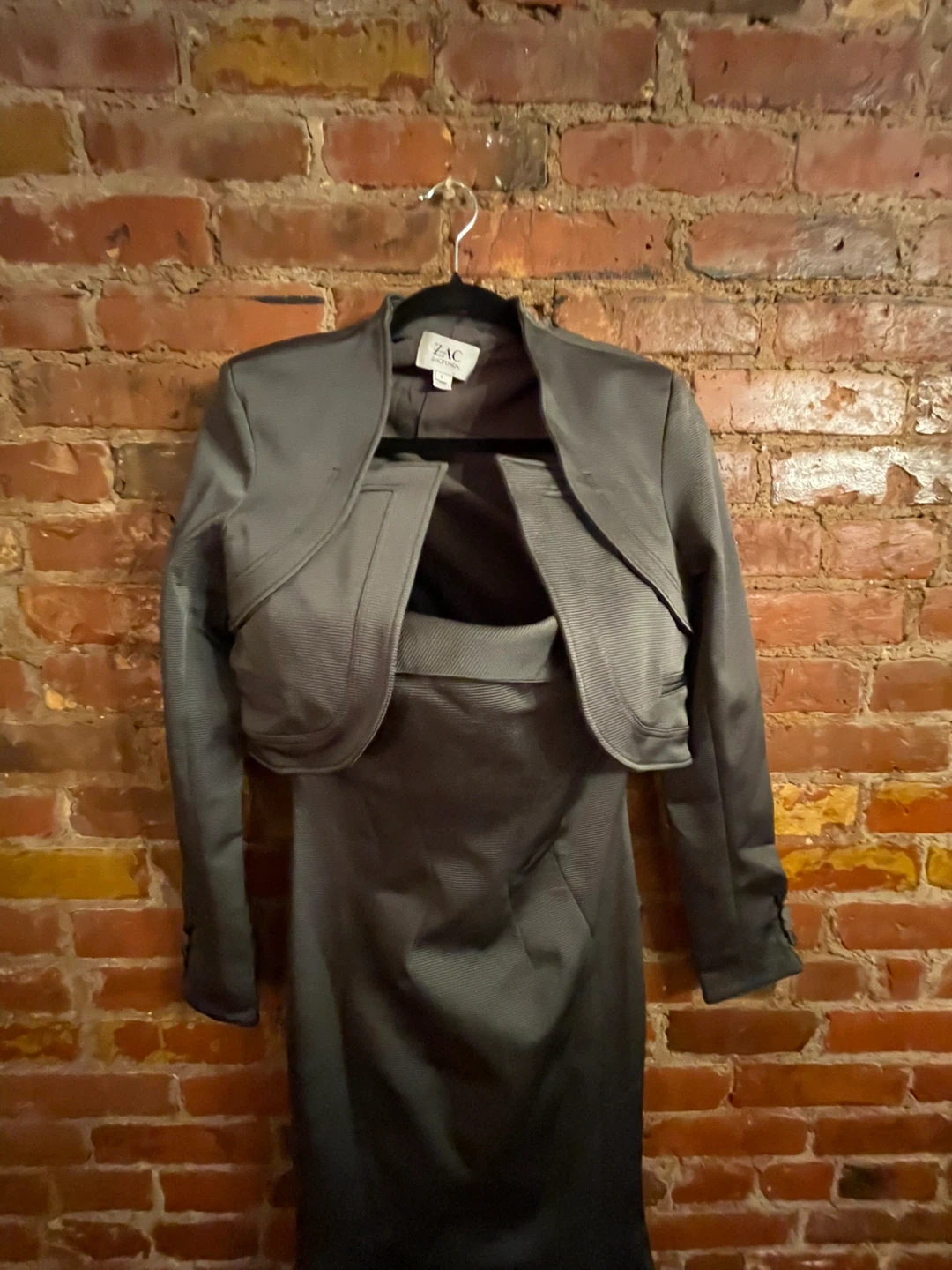 82Selling a beautiful gray dress with a matching cropped jacket from ZAC Posen This elegant set is perfect for a special occasion or a night out. The dress and jacket are in excellent condition and ready for a new home women’s size 6. Have incredible fabric and a mermaid silhouette.