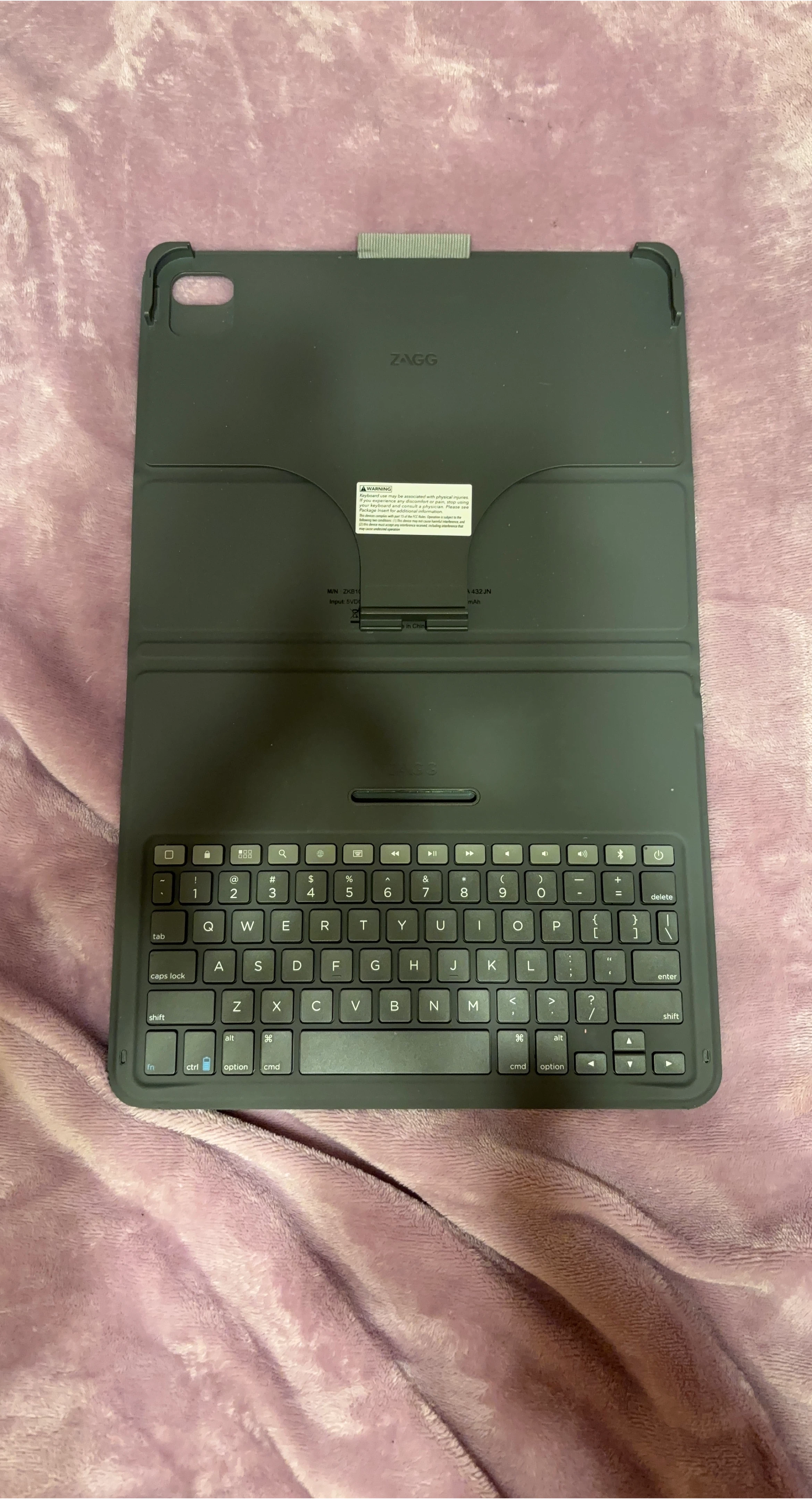 12Selling a ZAGG keyboard case for an iPad. It's in great condition and ready for a new home! The model number is ZKB10. It requires an input of 5V. Get ready to type away!