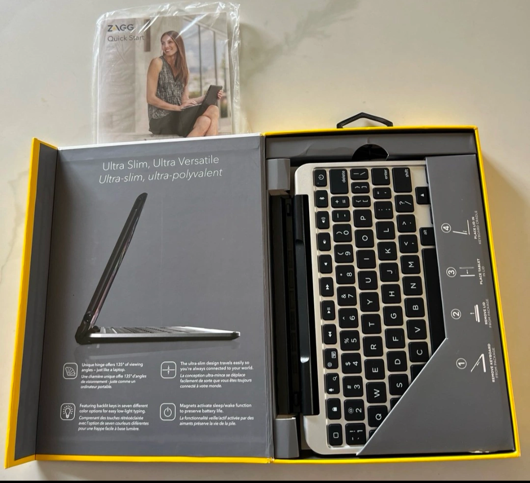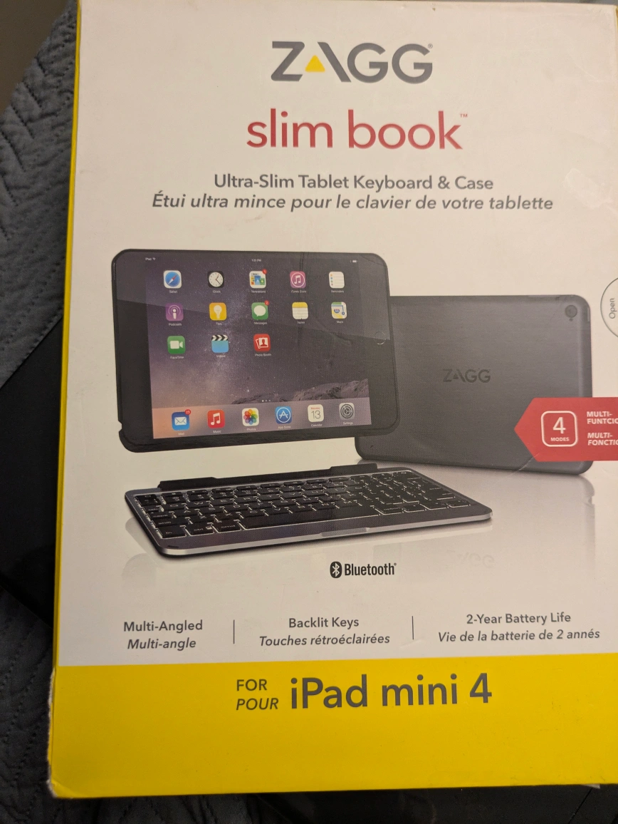 Selling a ZAGG Slim Book keyboard case for the iPad Mini 4. It's in great condition and comes with the original box and quick start guide! It's an ultra-slim tablet keyboard and case, featuring a unique hinge that offers 135° of viewing angles. The keyboard has backlit keys in seven different colors, and magnets activate sleep/wake function