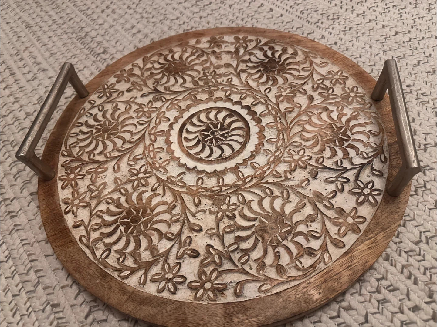 Here's a lovely round wooden serving tray! It features a beautiful floral inlay design carved into the surface and sturdy metal handles on either side. It's perfect for serving snacks or drinks, or just as a decorative piece for your home