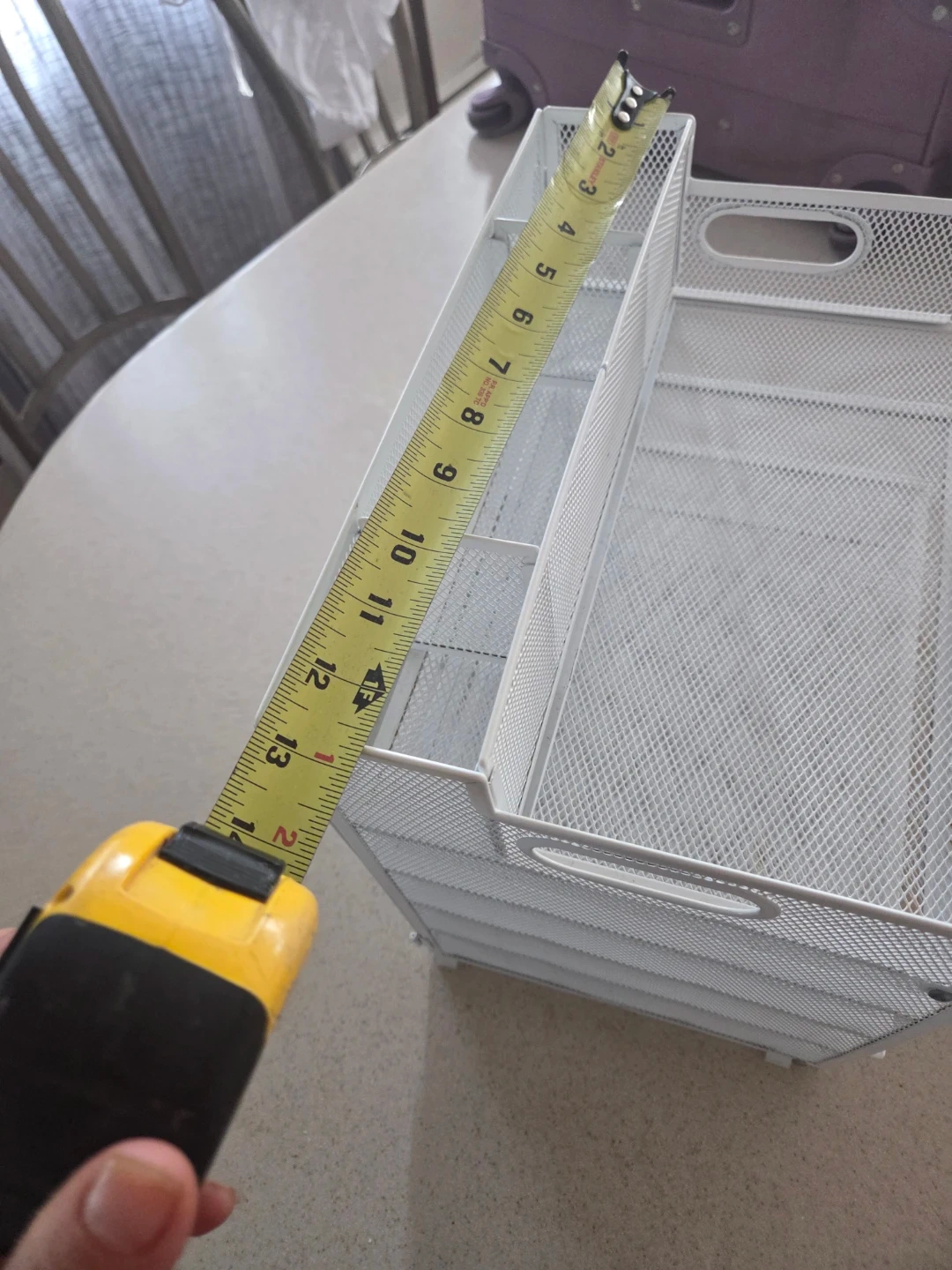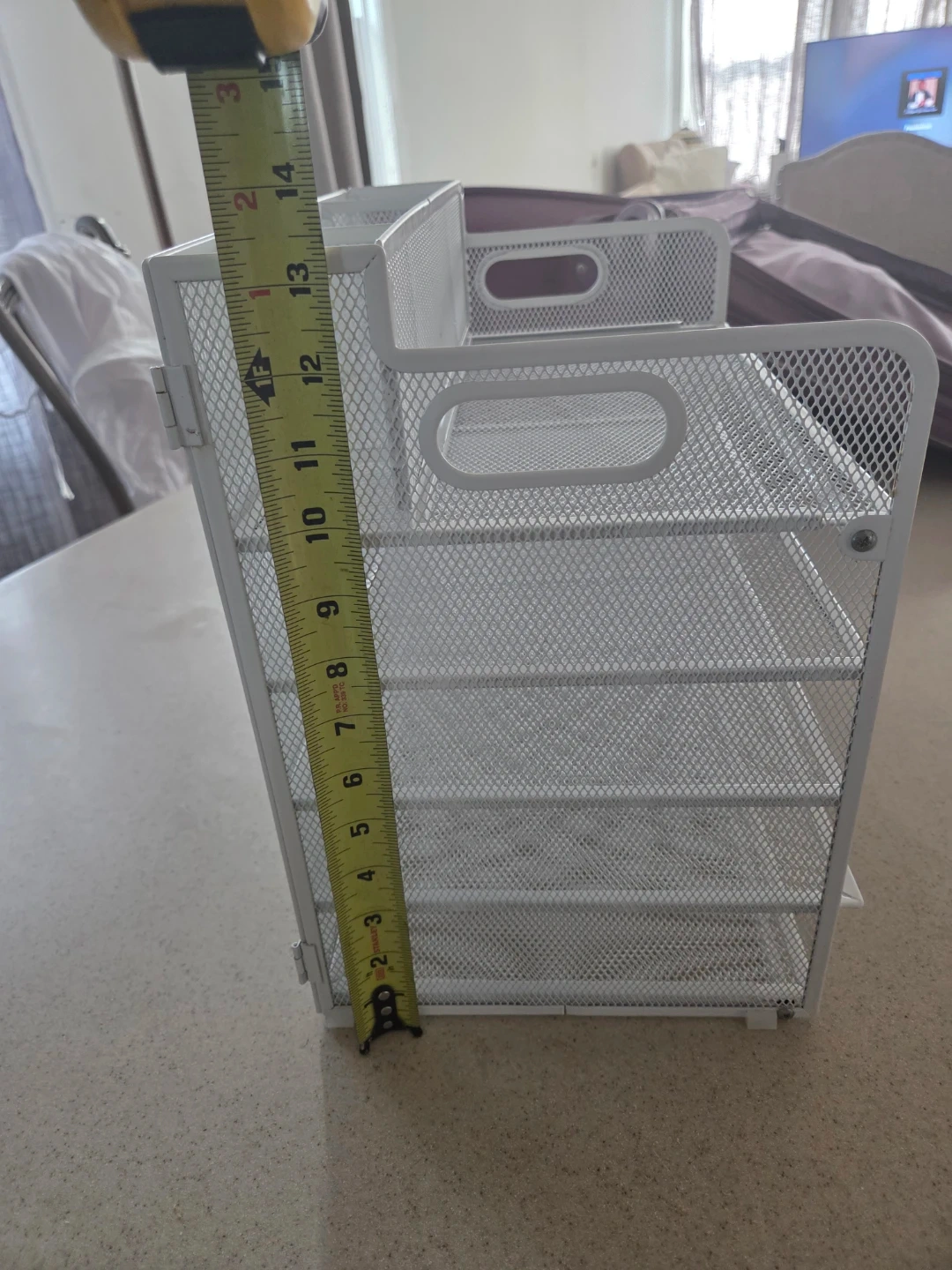 This white mesh desk organizer has five tiers for storing papers and supplies. It's made of durable metal mesh. The organizer measures approximately 13 inches tall and 9 inches wide.