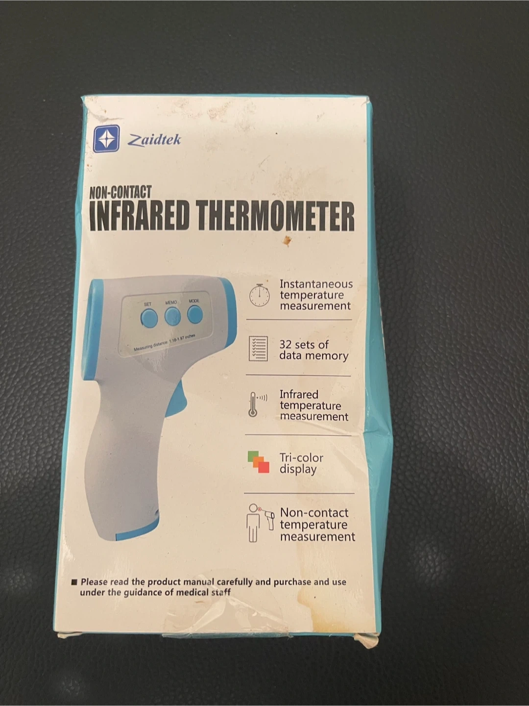 80Selling a Zaidtek non-contact infrared thermometer. It features instantaneous temperature measurement, 32 sets of data memory, infrared temperature measurement, and a tri-color display. It also provides non-contact temperature measurement.