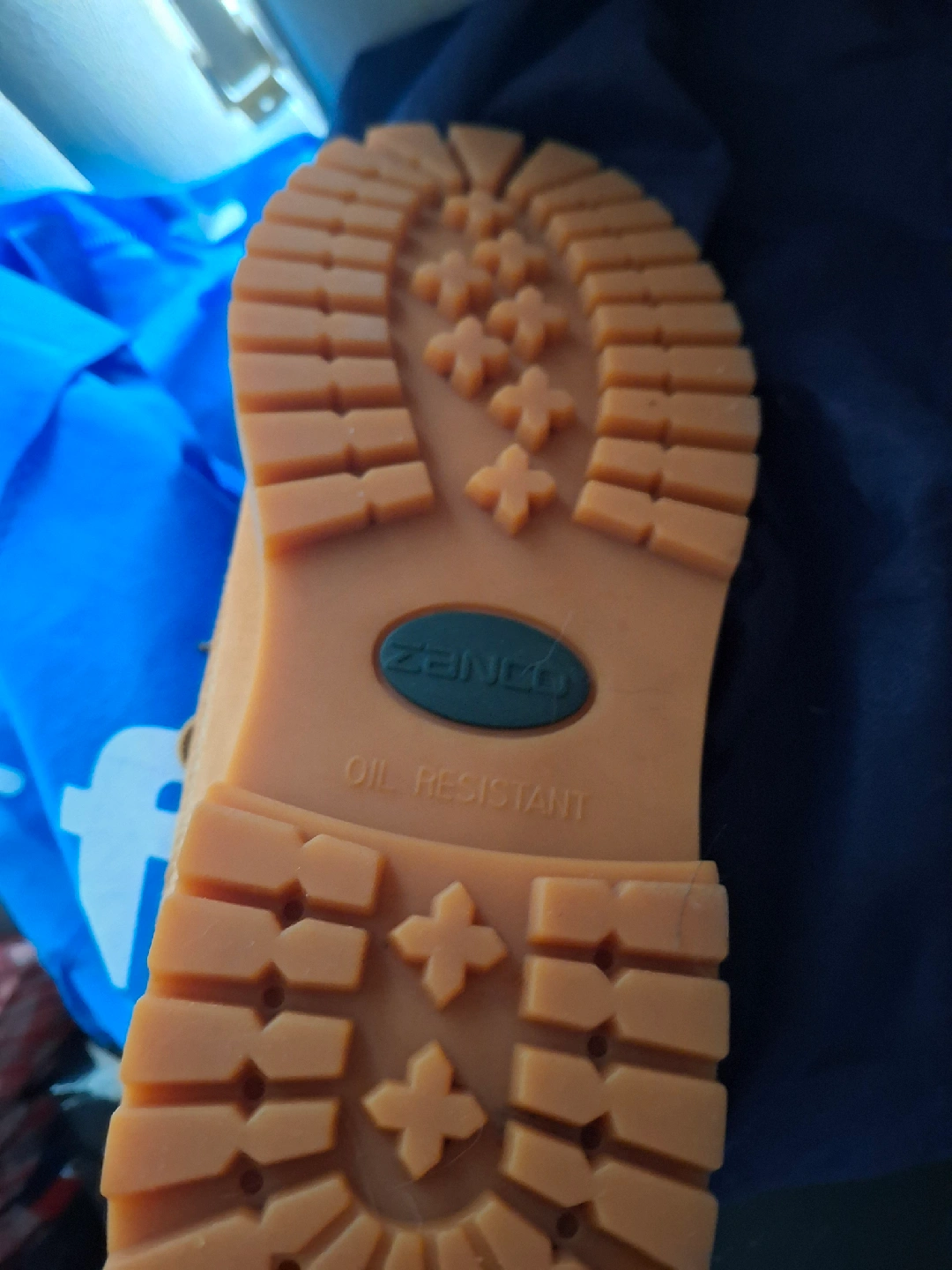 Selling a pair of Zanco work boots with genuine leather uppers. They are a size 8.5 in US sizing, 42 in European sizing, and 27 1/2 in Mexican sizing. The soles are oil resistant and have a rugged tread