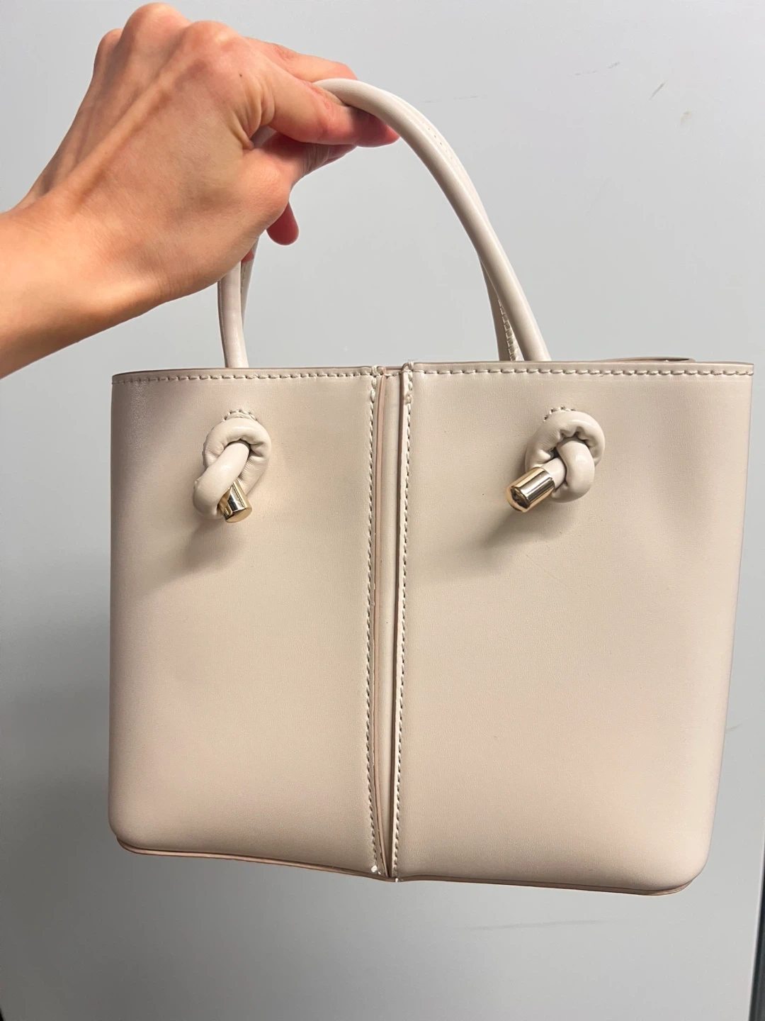 Selling a cute beige tote bag! It's in good condition and perfect for everyday use. Has a unique knot design on the handles that adds a touch of elegance