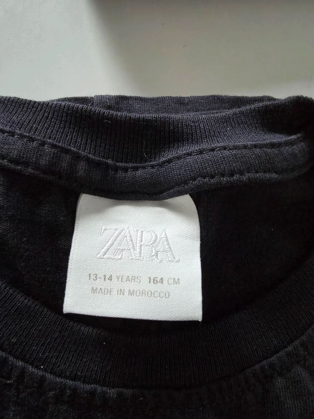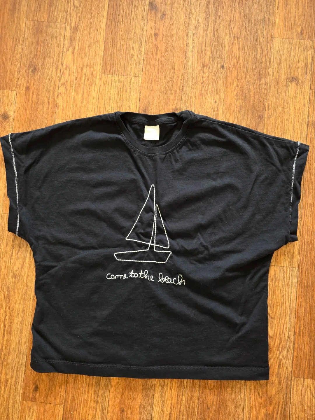 65Selling a Zara black top with a cute sailboat design and the words 'come to the beach'. The size is 13-14 years, which is about 164 cm. It's in great condition and ready for a new home!